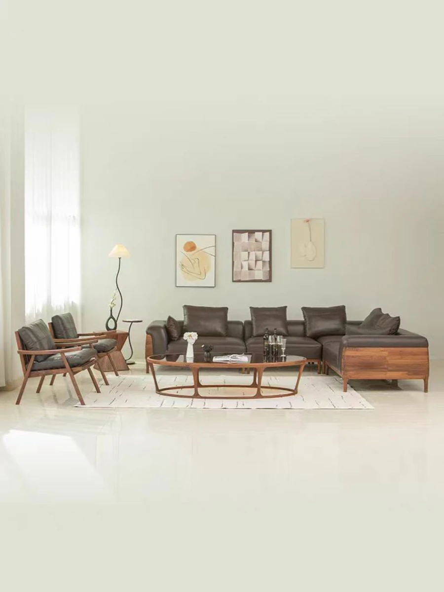 Nordic Italian Luxury Real Leather Solid Black Walnut Sofa Set - Minimalist Chaise Lounge for Living Room, Perfect for Modern Elegance and Comfort
