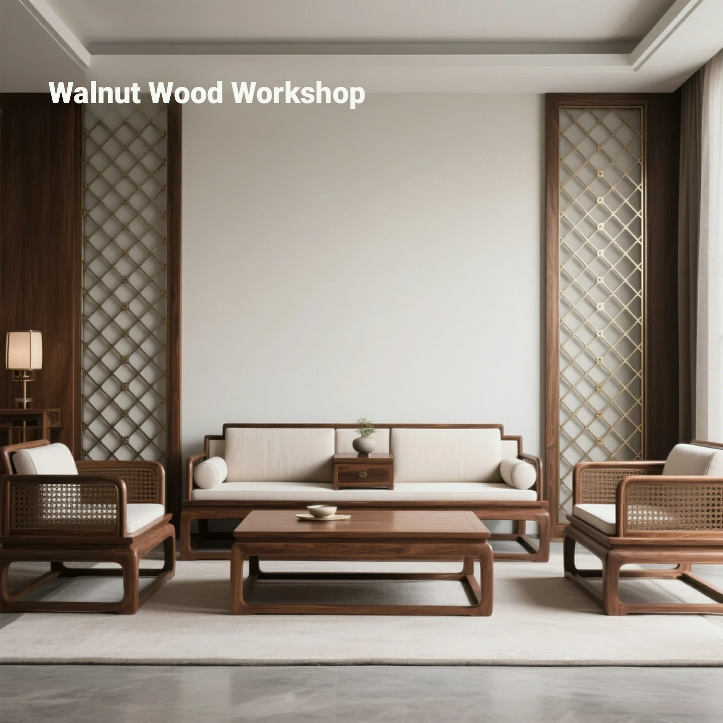 Modern Chinese Style Solid Wood Sofa Set - Minimalist Design in North American Black Walnut, Inspired by Song Dynasty Aesthetics for Spacious Living Rooms with Zen Elegance.