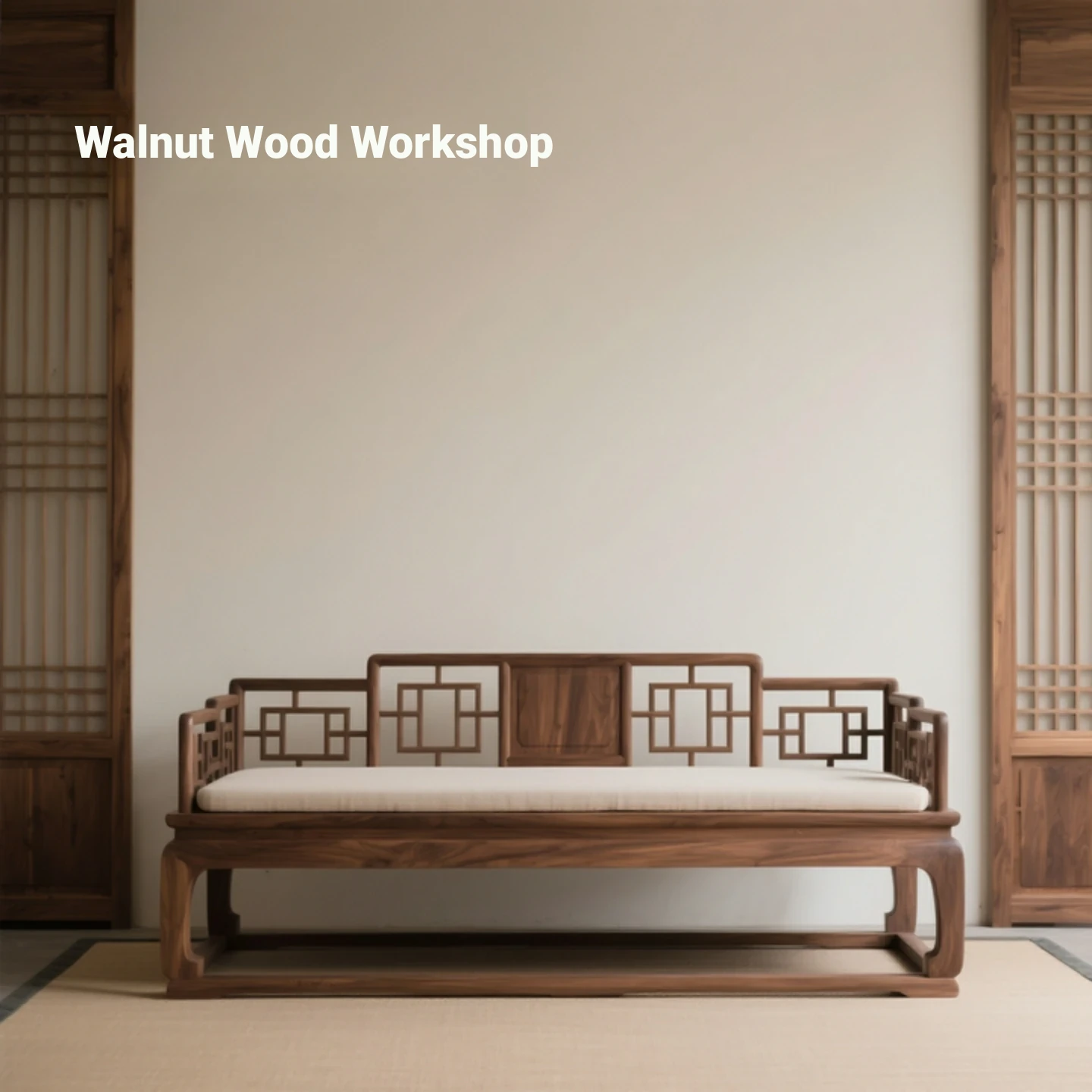Modern Chinese Solid Wood Luohan Bed - Minimalist North American Black Walnut Zen-style Sofa for Tea Room and Living Room, Perfect for Small Spaces
