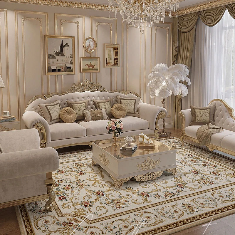 French Luxury Solid Wood Carved Upholstered Sofa - Elegant European Palace Style Three-Seater Chaise Lounge Combination for Villa Living Room Furniture
