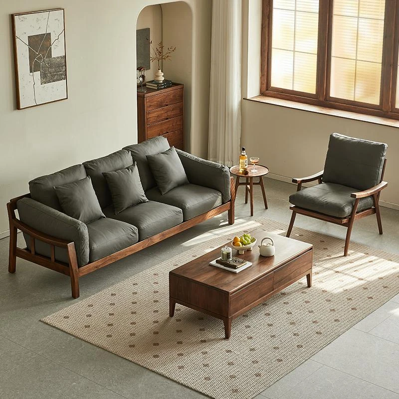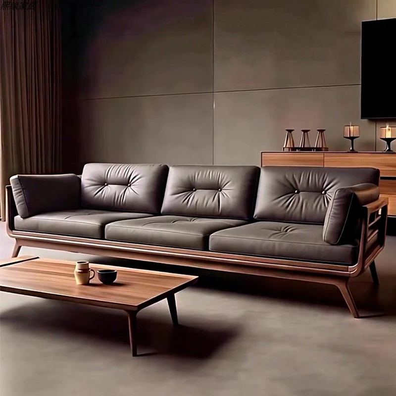 North American Black Walnut Wood Sofa - Nordic Minimalist Genuine Leather Sofa Set for Living Room - All Solid Wood Three-Seater Furniture