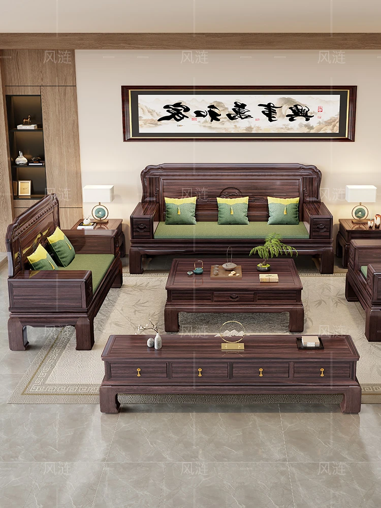 Elegant Chinese-Style Solid Wood Sofa Set for Spacious Villas - Minimalist Zen-Inspired Design in Luxurious Blackwood Furniture for Modern Living Rooms