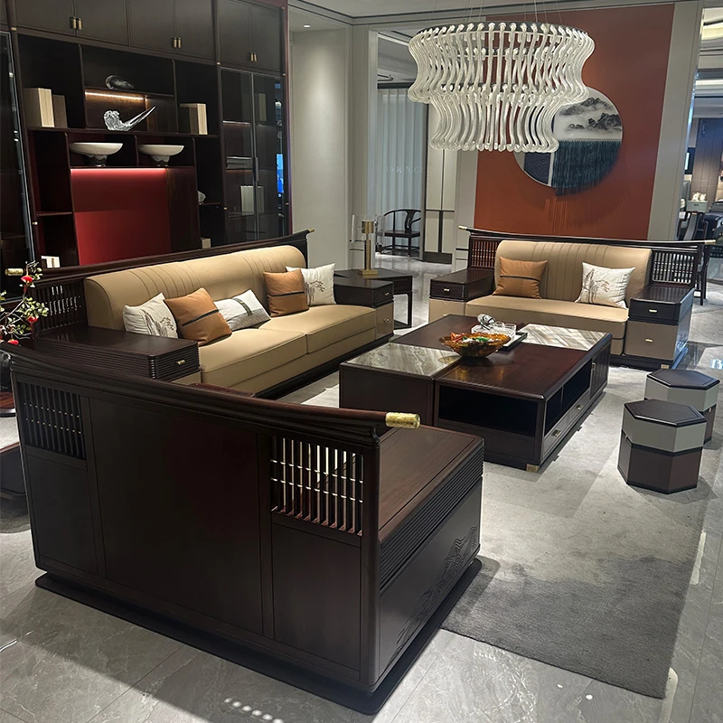 Elegant New Chinese Style High-End Black Walnut Sofa - 2025 New Model, Minimalist Modern Solid Wood and Genuine Leather, Perfect for Small Spaces