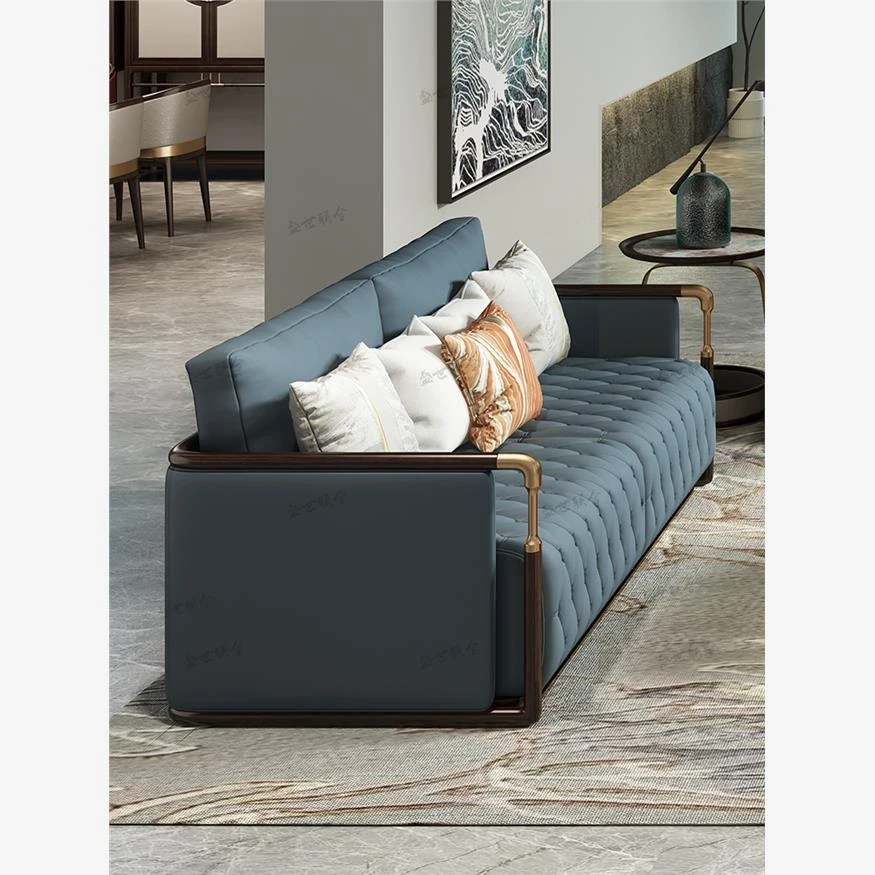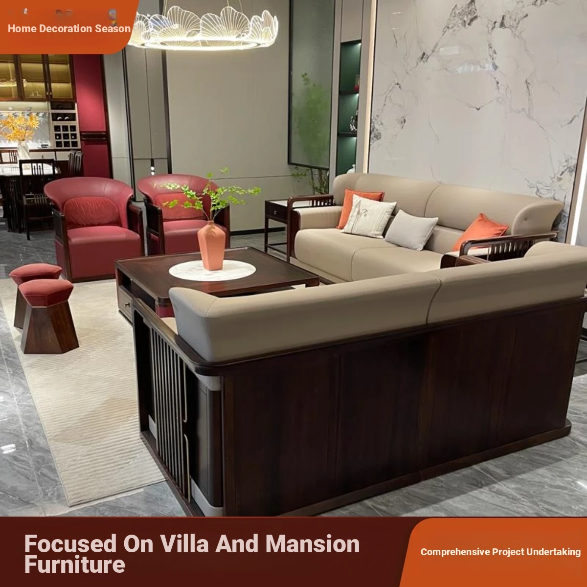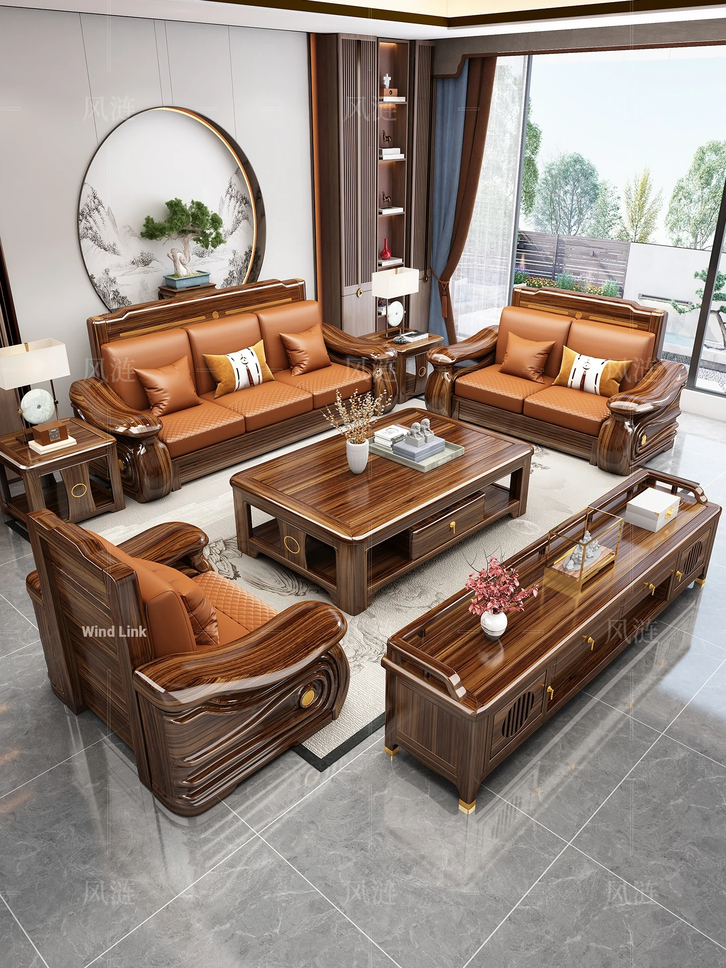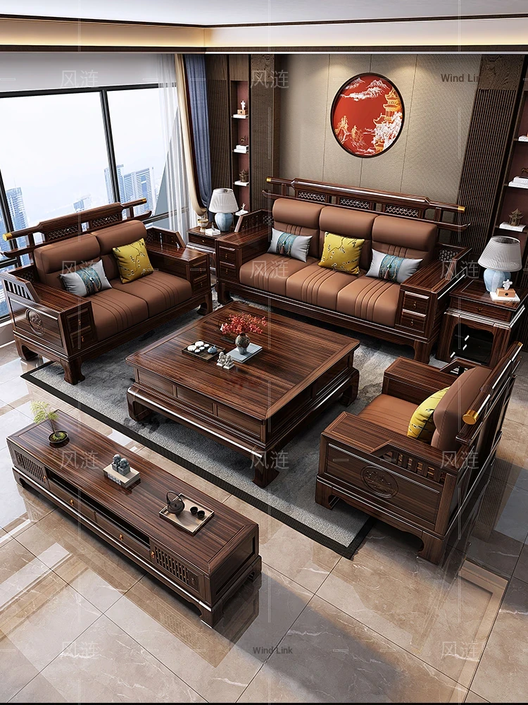 Exclusive Designer Modern Chinese Solid Wood Sofa Set - Luxurious Black Walnut for Villas and Small Spaces - Minimalist Genuine Leather Comfort