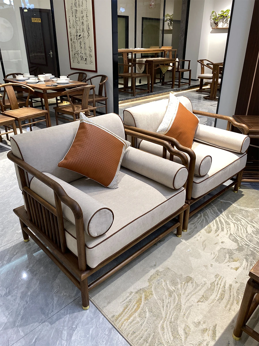 Modern Chinese Style Walnut Sofa Set - Zen-Inspired Solid Wood Fabric Sofa for Living Room, 123 Combination Office Furniture