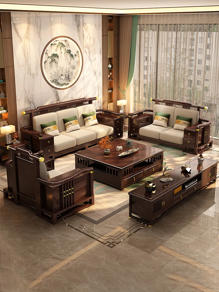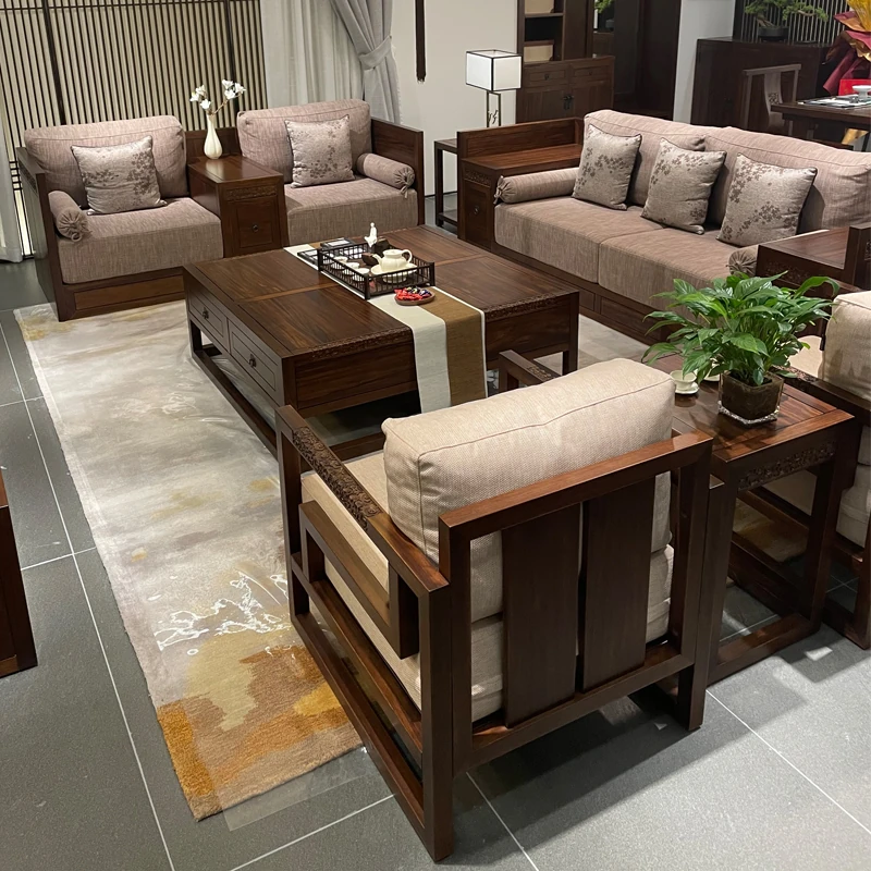 2025 New Chinese Style Sofa - High-End Modern Minimalist Black Walnut Fabric and Solid Wood Sofa for Small Living Spaces