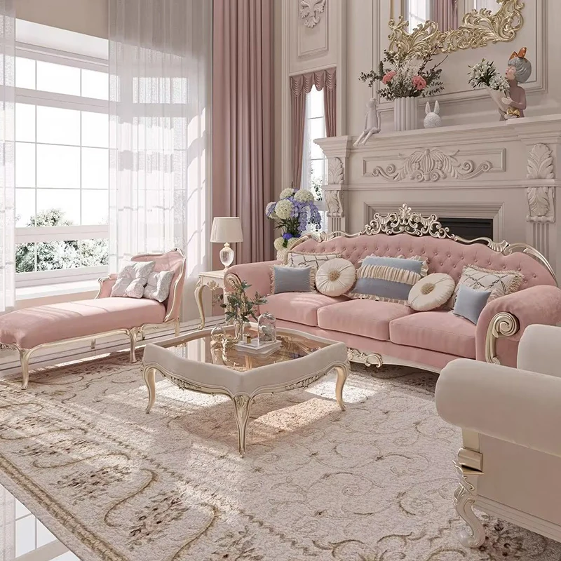 French Elegant Luxury Sofa - Solid Wood Carved Fabric Three-Seater & Loveseat Chaise Lounge Combination, High-End European Villa Style