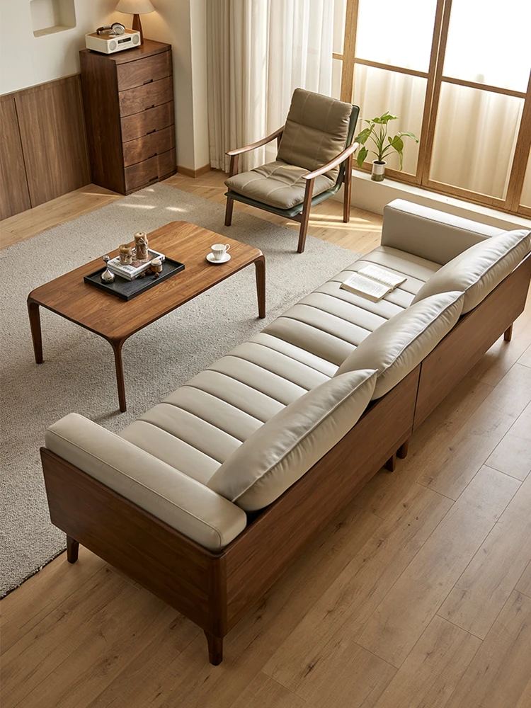 Yamoo Nordic Minimalist Solid Wood Sofa - North American Black Walnut 4-Seater Leather Couch for Living Room, Perfect for Home Comfort and Style!