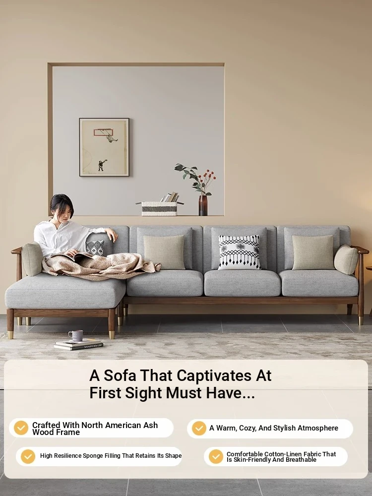 Nordic Fabric Sofa for Living Room - 2025 New Arrival in Ash Wood & Black Walnut Color, Versatile New Chinese Style Solid Wood Furniture for Year-Round Comfort