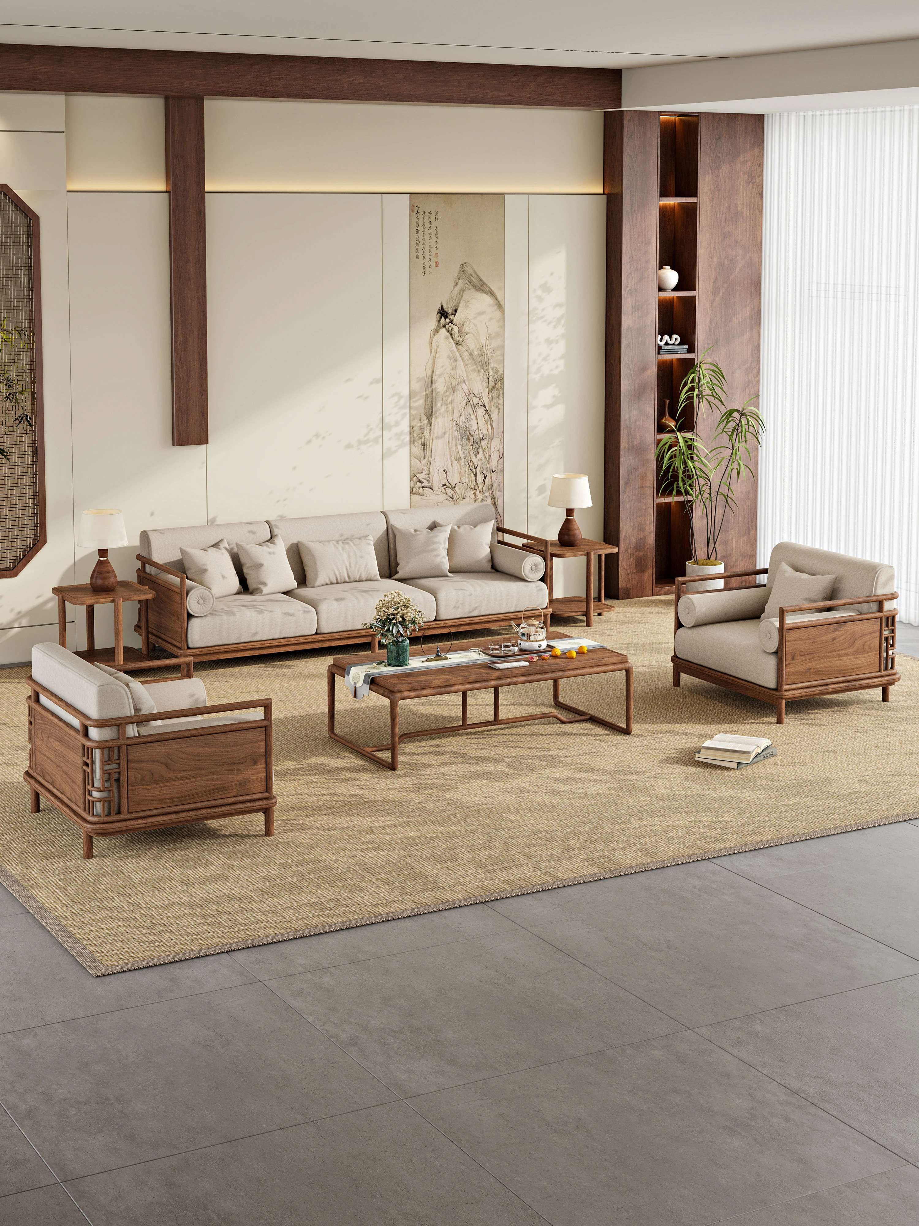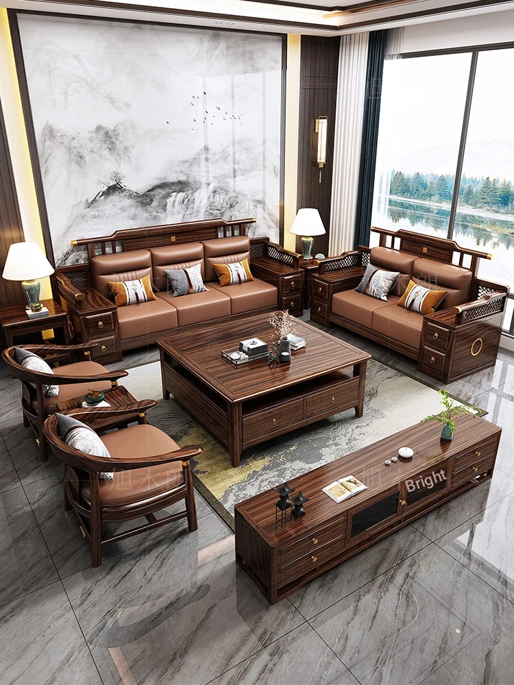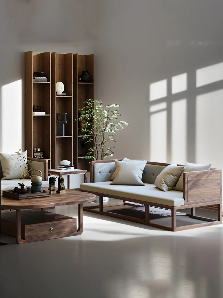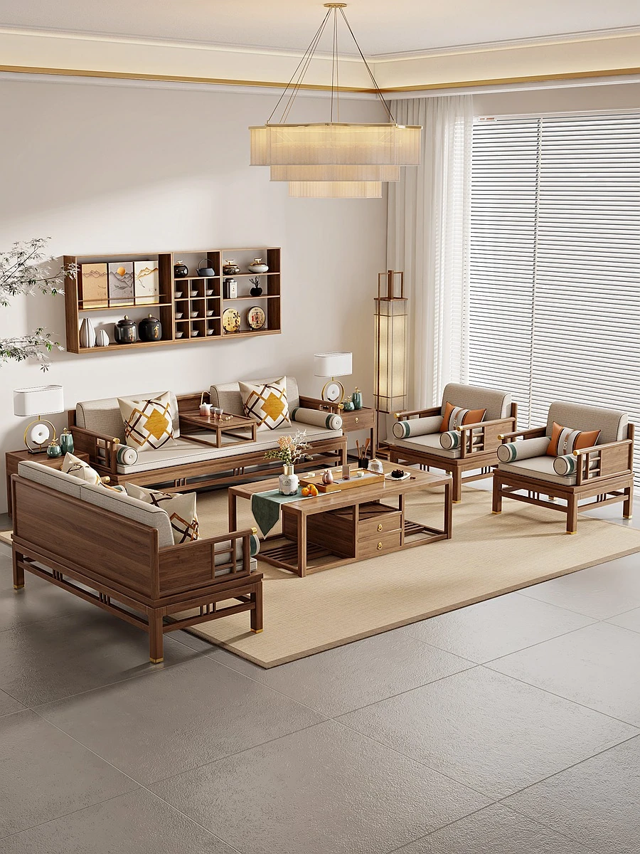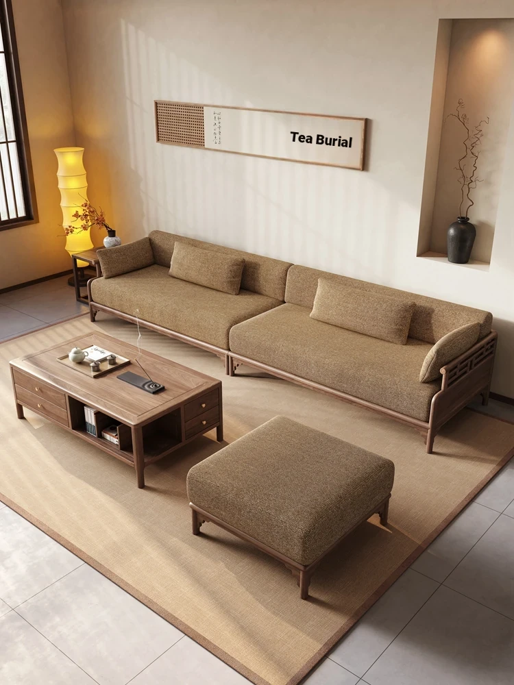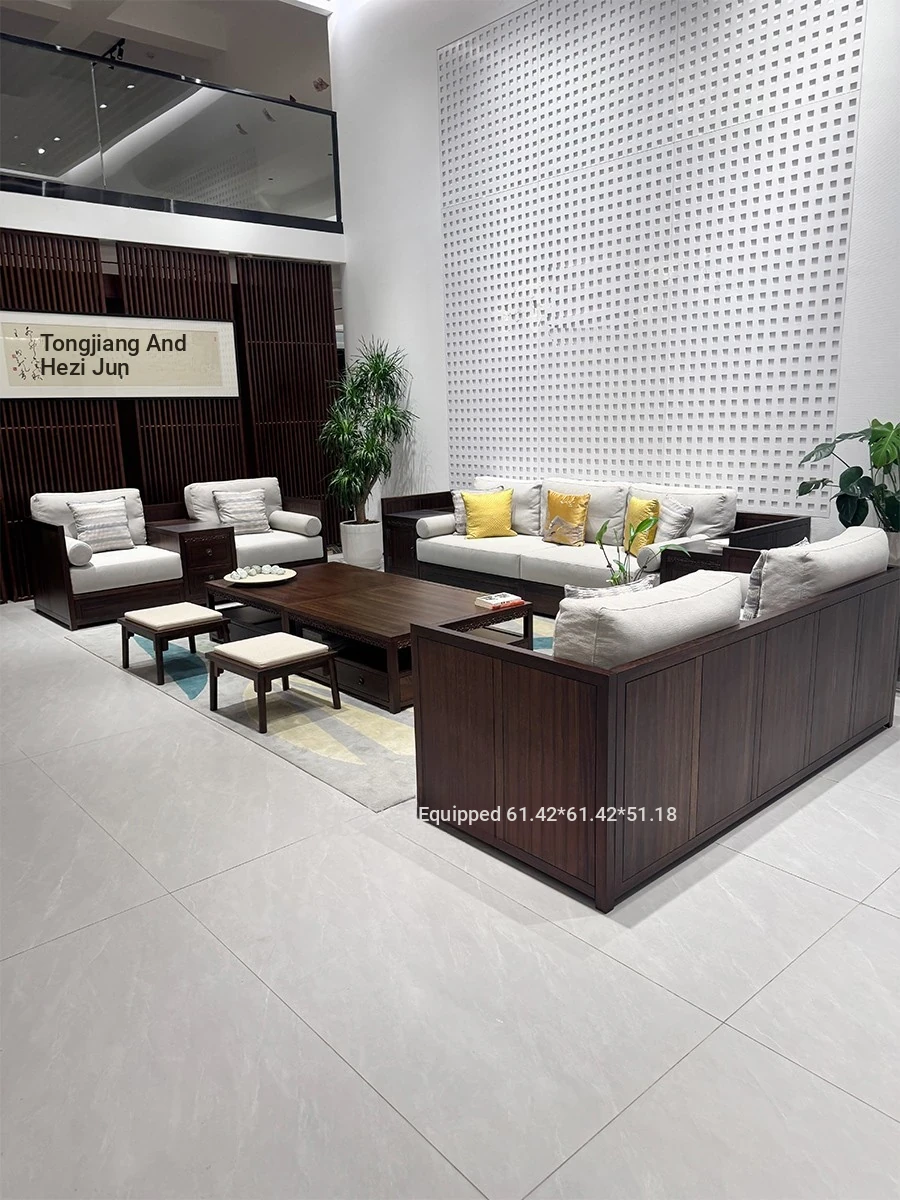 Elegant New Chinese Style Solid Wood Sofa Set - Zen-Inspired Song Dynasty Aesthetic for Villas, Hotels, and Lounges - Premium Walnut Furniture for a Sophisticated Living Space