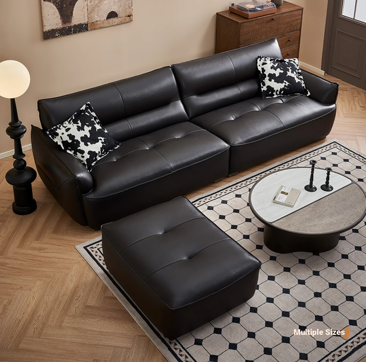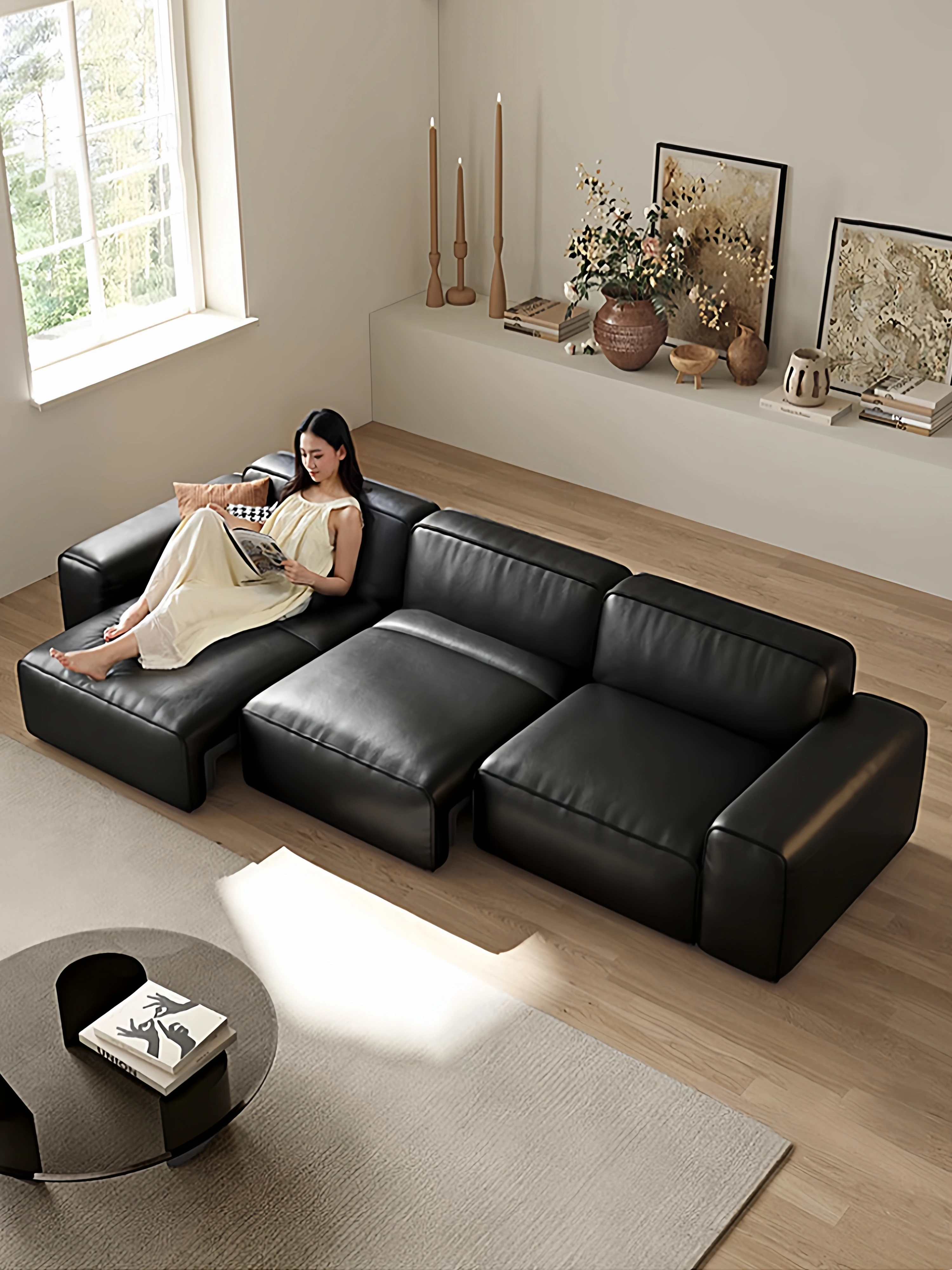 Nordic Minimalist Solid Black Walnut Wood Sofa with Genuine Leather – Perfect for Small Living Rooms, Elevate Your Space with Chic Simplicity and Timeless Elegance.