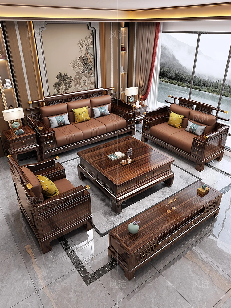Luxury Solid Wood Sofa Set in New Chinese Style - Versatile Black Gold Wood, Perfect for Any Home, Villa, or Living Room. Ideal for All Seasons and Space Sizes, Elevate Your Interior with High-End Furniture.