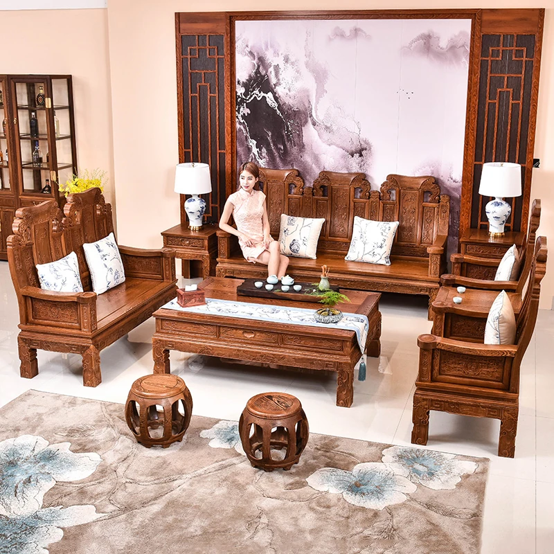 Rosewood Chinese Style Solid Wood Sofa Set - Antique Carved Ming and Qing Dynasty Design, Perfect for Large Spaces, Dual-Use for Winter and Summer, Ideal Living Room Furniture