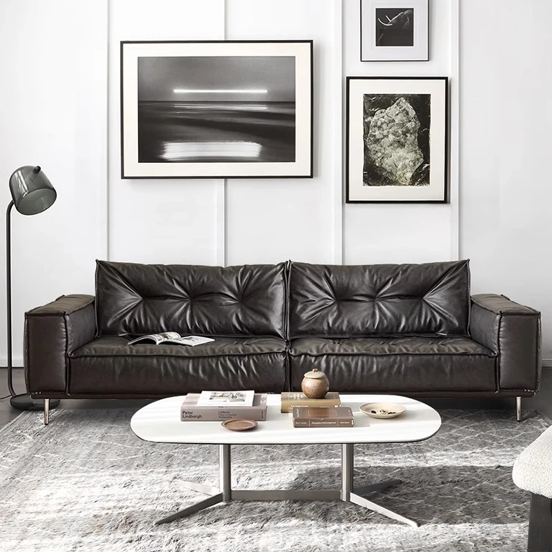 Italian Minimalist Genuine Leather Sofa - American Light Luxury Retro Design for Small Living Rooms - Stylish Black Cloud Sofa for Three People
