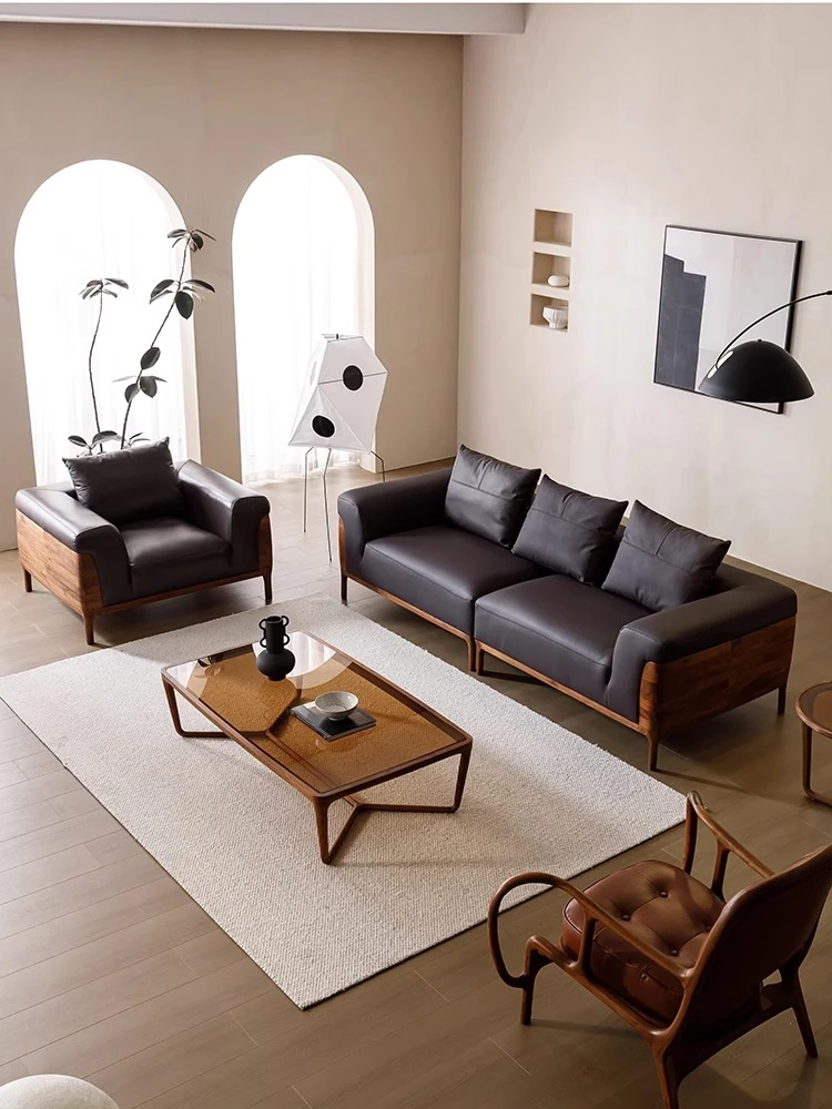 新中式スタイルの北米産ブラックウォールナット無垢材使用、シンプルで洗練された禅の雰囲気が漂う3〜4人掛け本革ソファ。ヴィラにぴったりの落ち着いたデザインで、心地よいひとときを演出します。