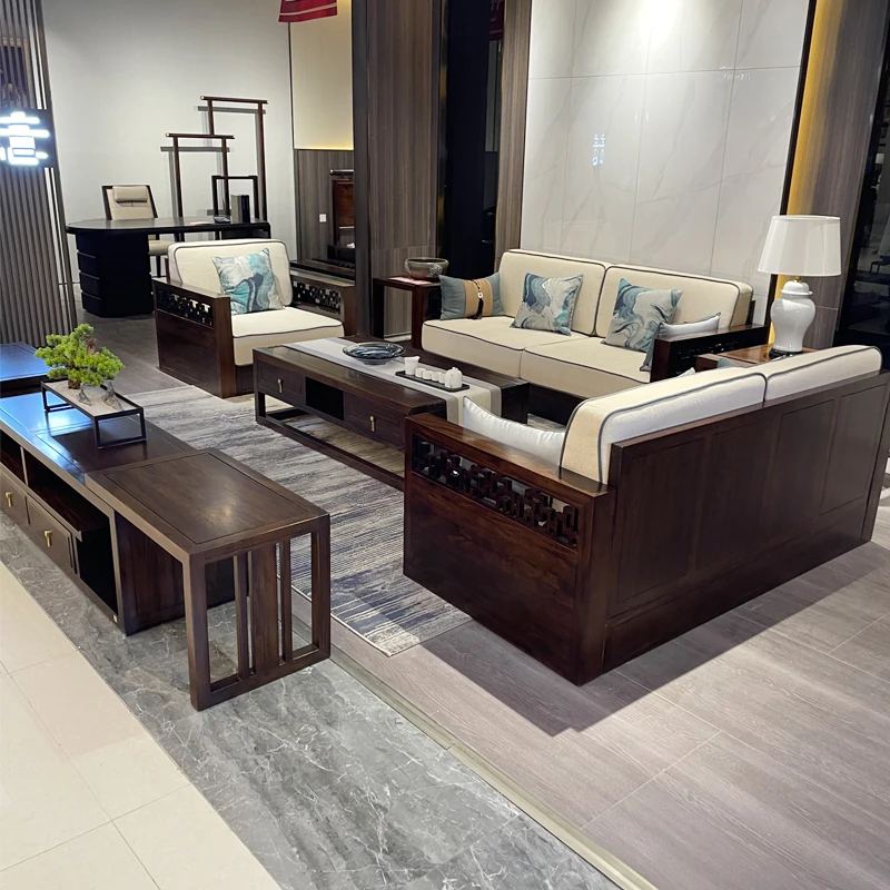 新中式ウッドソファセット - 冬夏兼用、大小戸型にも最適なクラシックリビング用家具。心安らぐ禅のコンセプトで、上質なウッディブラック材が魅力的。おしゃれで機能的な空間を演出!