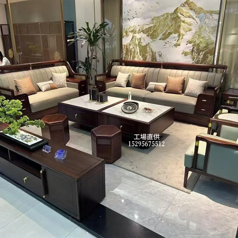 新中式全実木ソファセット|シンプルでモダンなウルキン材使用|高級感溢れる本革仕上げ|広々としたリビングに最適な黒檀家具で、洗練された空間を演出!