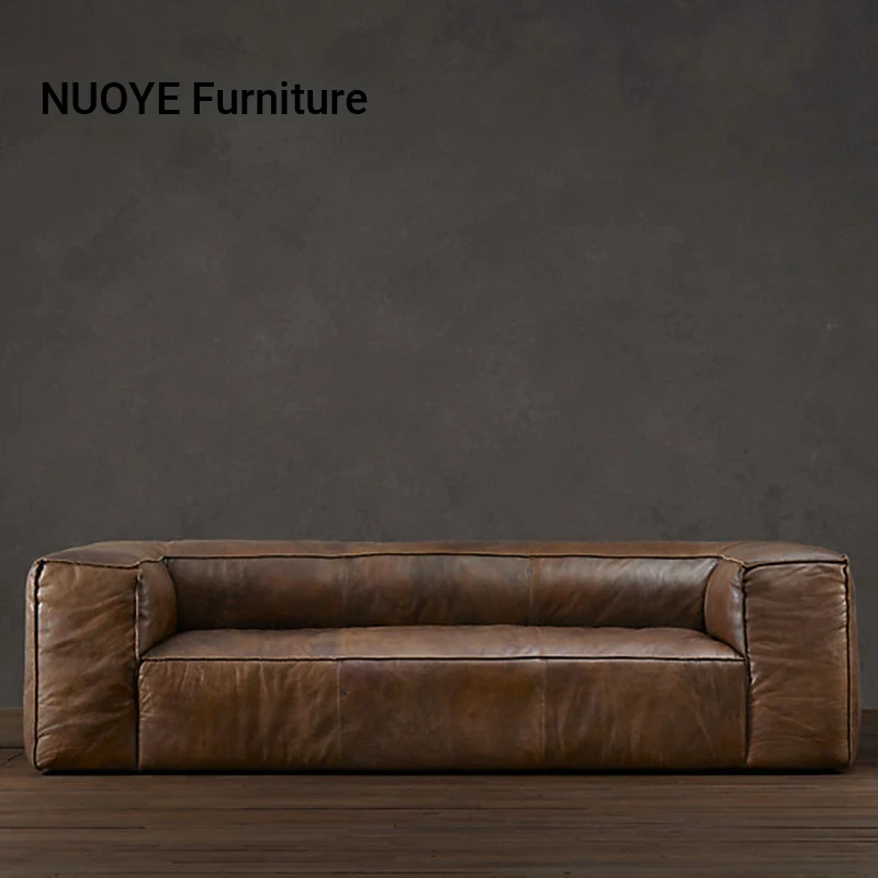 American Country Nordic Retro Small Loft Living Room Tofu Block Bar Sofa for 3-4 People - Genuine Leather Industrial Style Couch