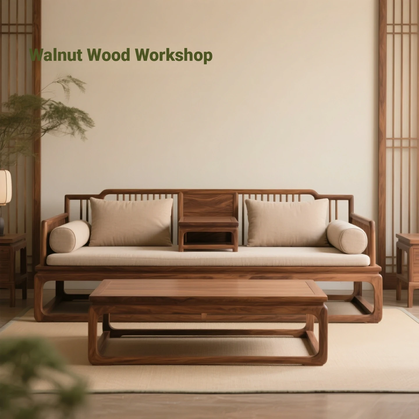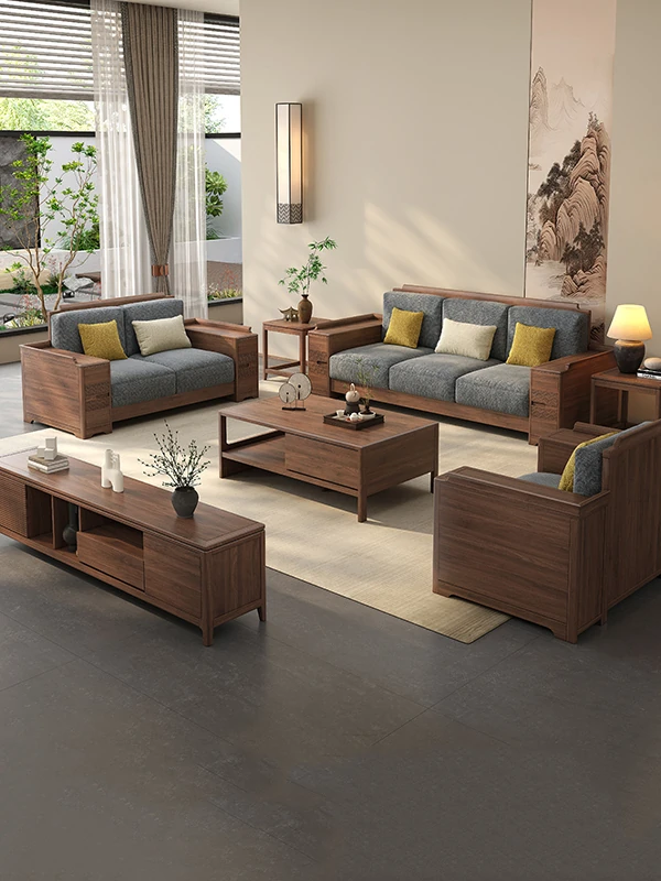 Minimalist Chinese Style North American Black Walnut 2025 Solid Wood Sofa - Versatile All-Season Four-Seater Living Room Sofa with Coffee Table