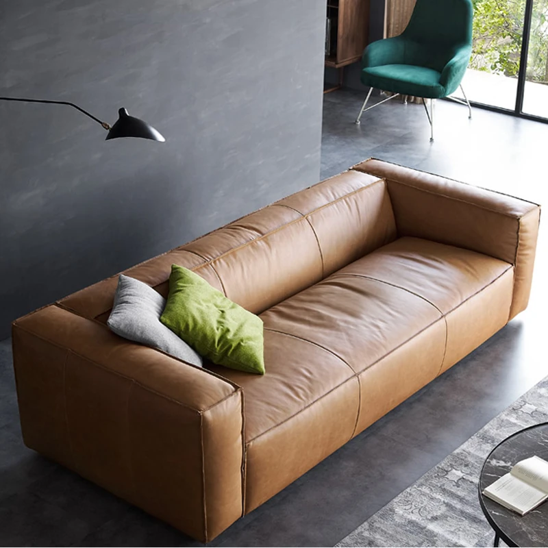 Nordic Italian Wabi-Sabi Style Minimalist Top-Grain Leather Sofa for Living Room - Vintage Mid-Century Design for 3-4 People, Perfect for Small Spaces