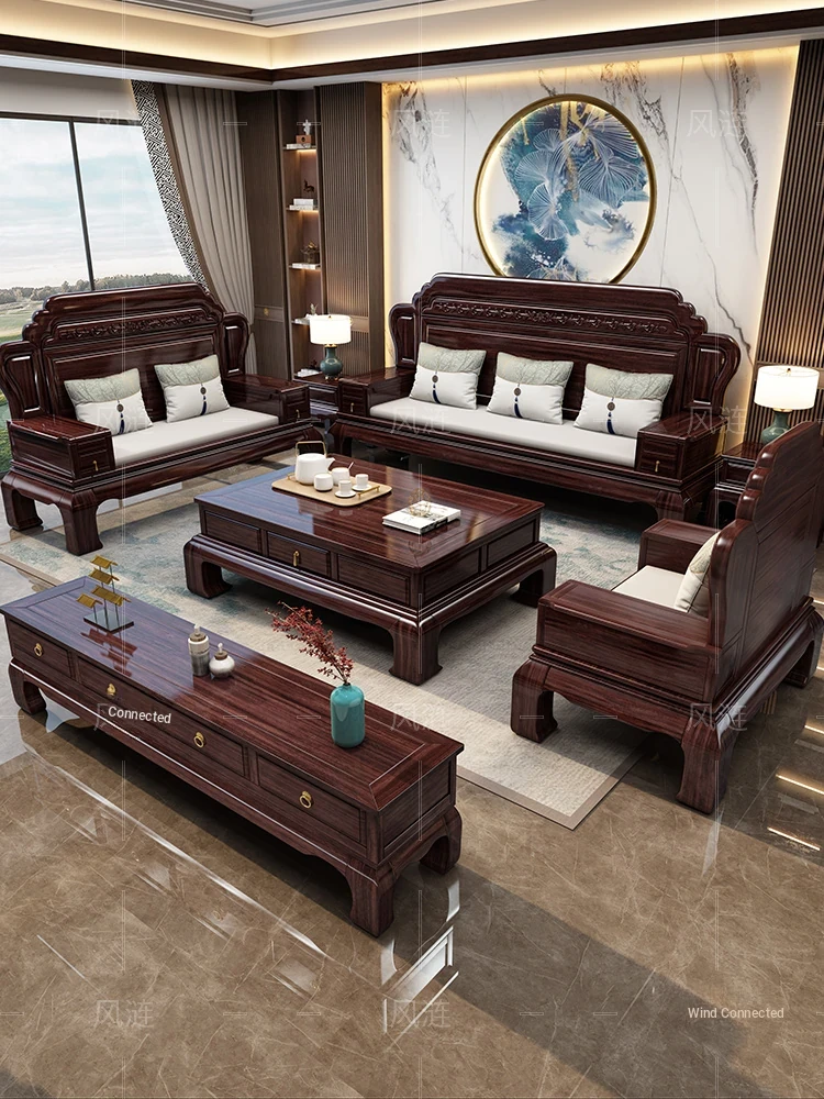 Exclusive Design: New Chinese Style Solid Wood Sofa Set - Modern Villa Blackwood and Ebony for Spacious Living Rooms