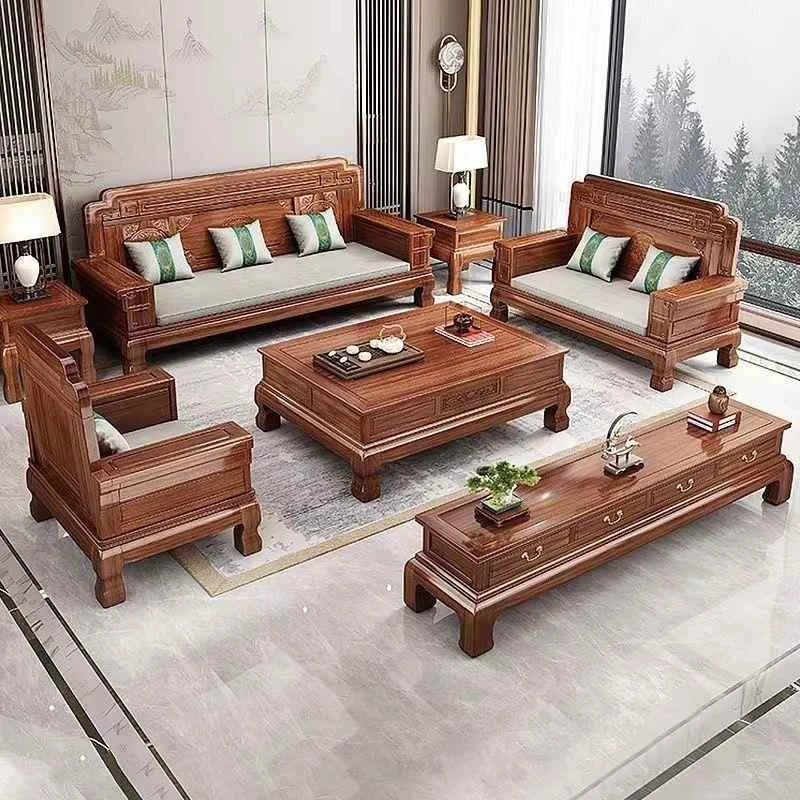 新中式ウッジン木製リビングルーム用コンビネーションソファ - 冬夏兼用、禅の雰囲気漂うアンティーク調彫刻入りフルセット紅木家具でおしゃれな空間を演出!