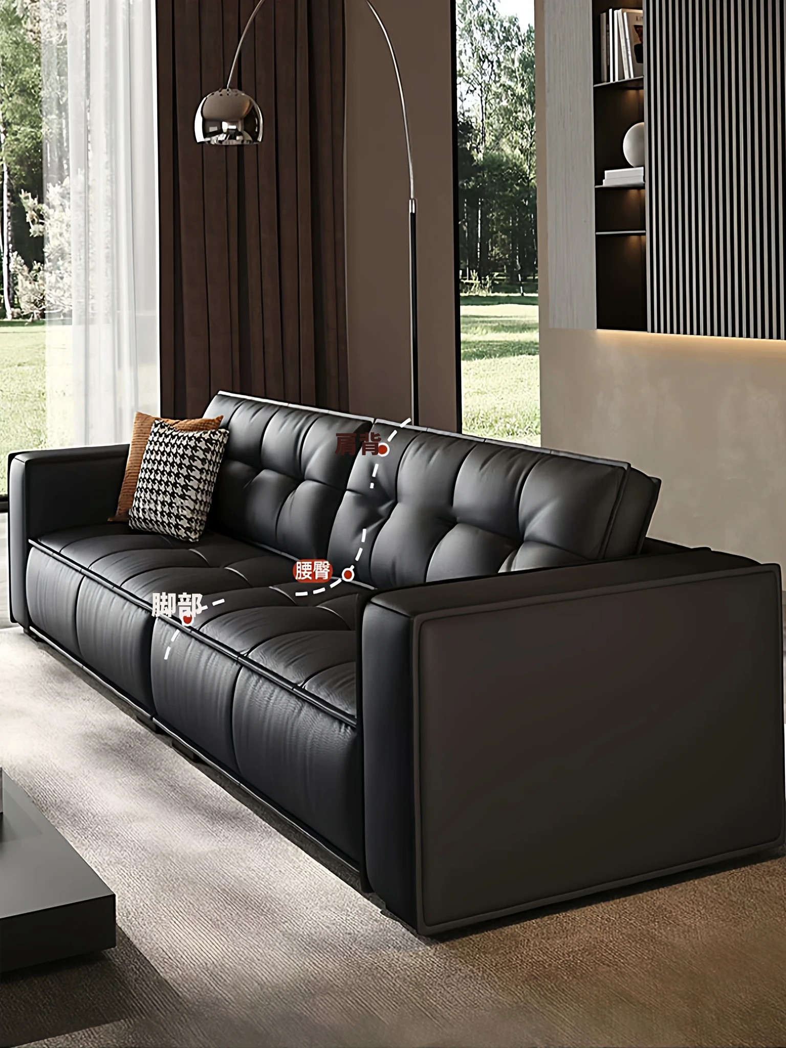 イタリアンミニマリズムの本革ソファ|アメリカンラグジュアリーの復古スタイル|コンパクトなリビングに最適なブラッククラウドソファ|3人掛けの直線デザインで洗練された空間を演出!