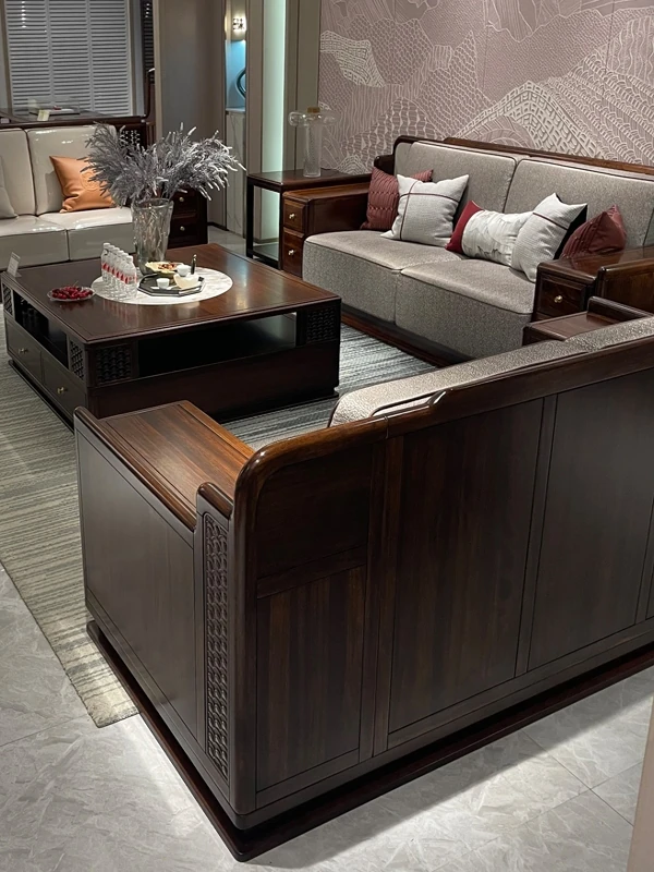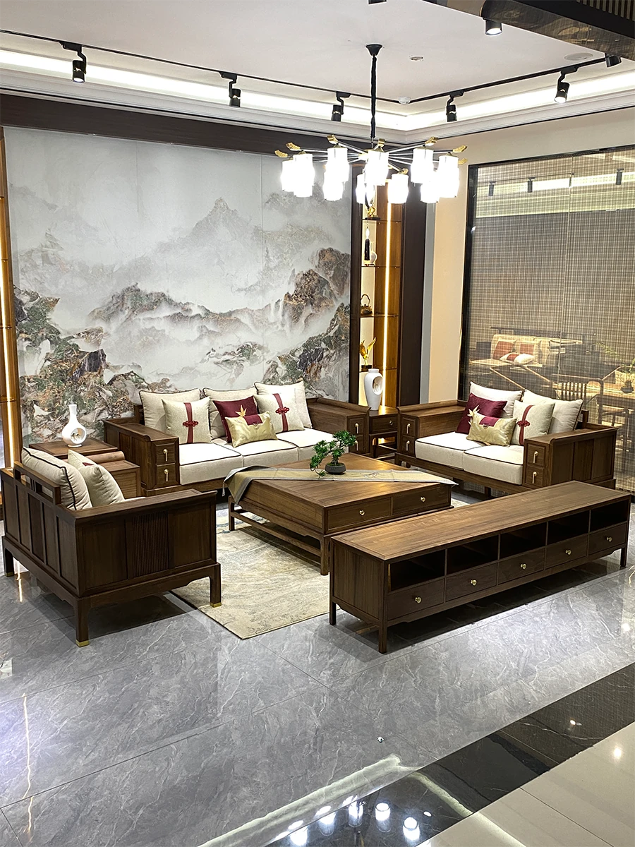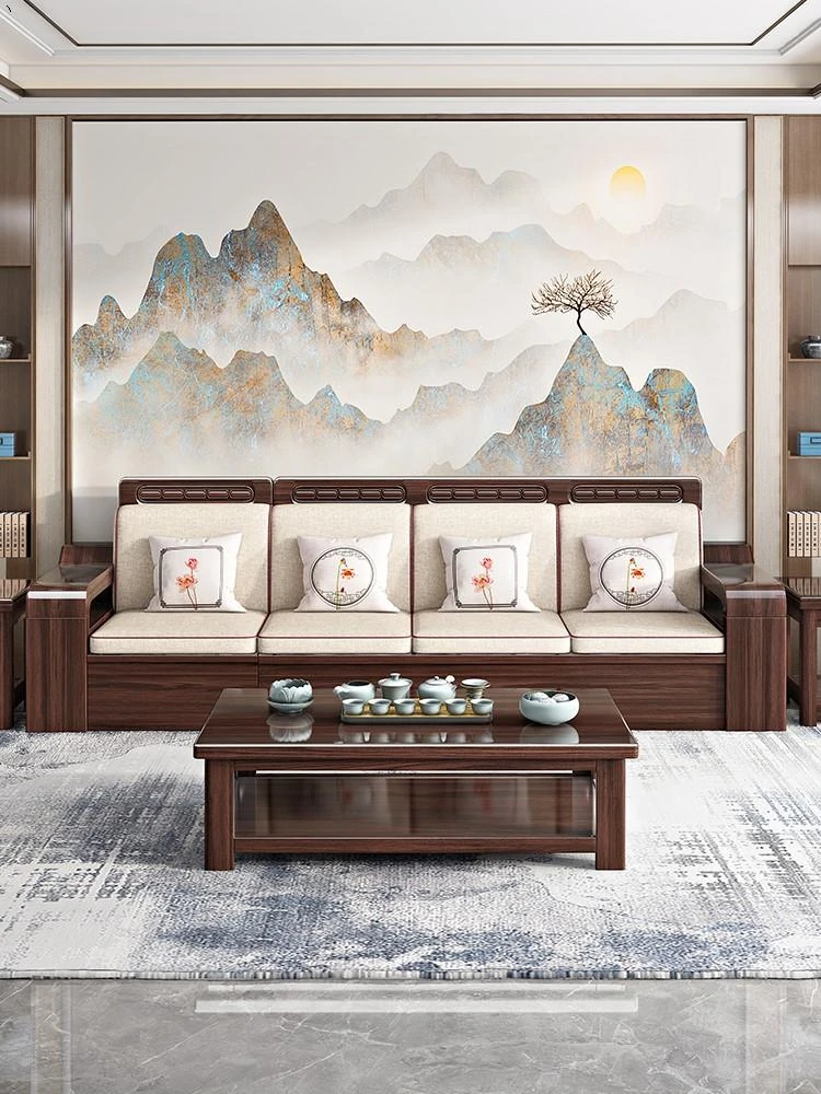 新中式デザインの北米産ブラックウォールナット無垢材ソファ - 禅の美学を取り入れた現代的な宋式スタイル。広々としたリビングや大邸宅にぴったりの高級家具です。洗練された空間を演出し、心安らぐひとときをお届けします。