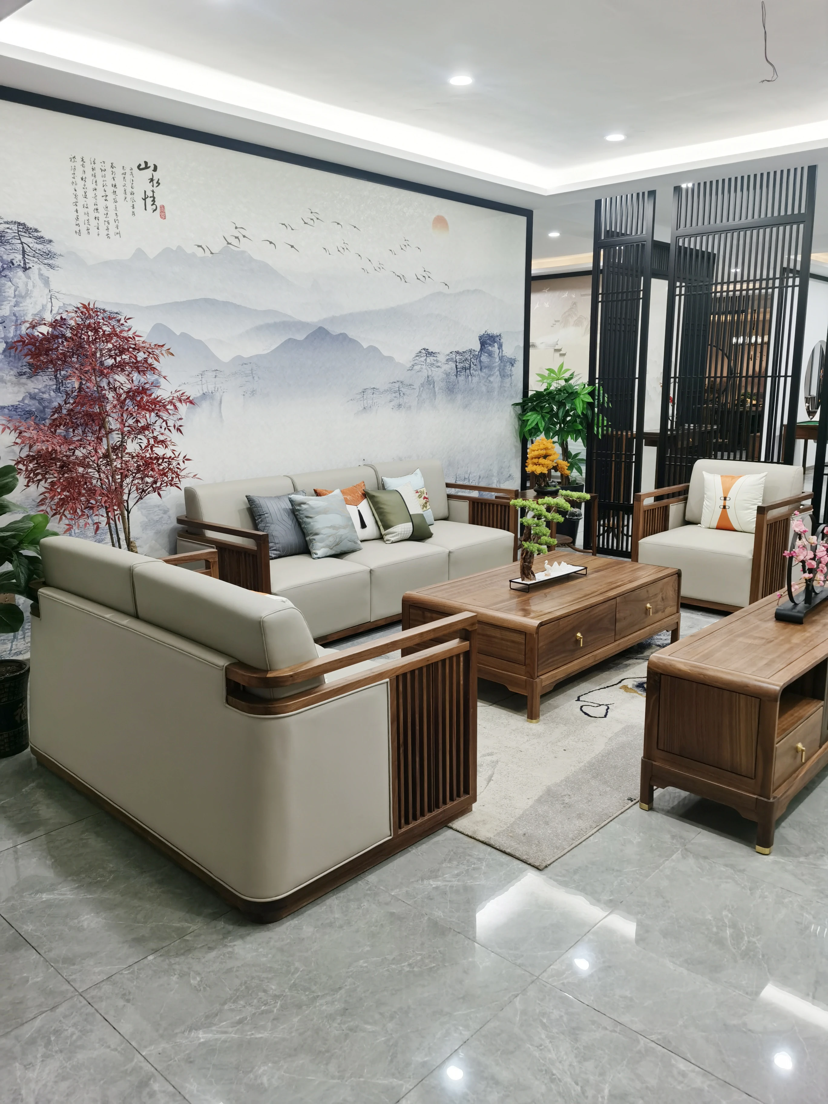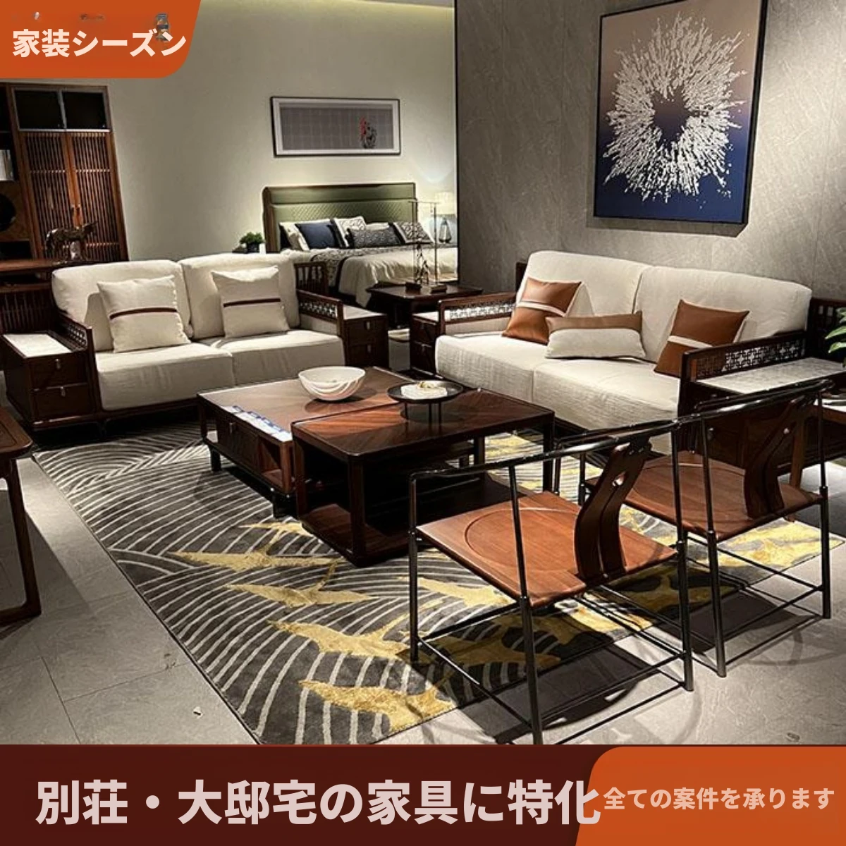 新中式デザインの全実木ソファとファブリックのコンビネーション。広々としたリビングや別荘にぴったりの高級感あふれる禅スタイルの中国風家具。おしゃれな空間を演出します!