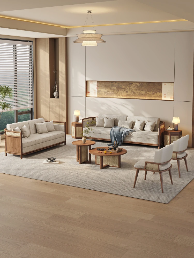 新中式デザインの無垢ウッドソファ、シンプルでモダンな禅スタイル、リビングや別荘にぴったりな小型中国風コンビネーション家具。心地よい空間を演出し、落ち着いた雰囲気をお楽しみください。