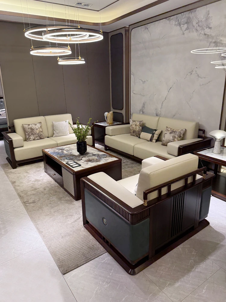 新中式北米産ブラックウォールナット真皮ソファー - 宋式美学と禅の雰囲気を持つ民宿・別荘・オフィスに最適な高級無垢家具!心を癒す空間を演出します。