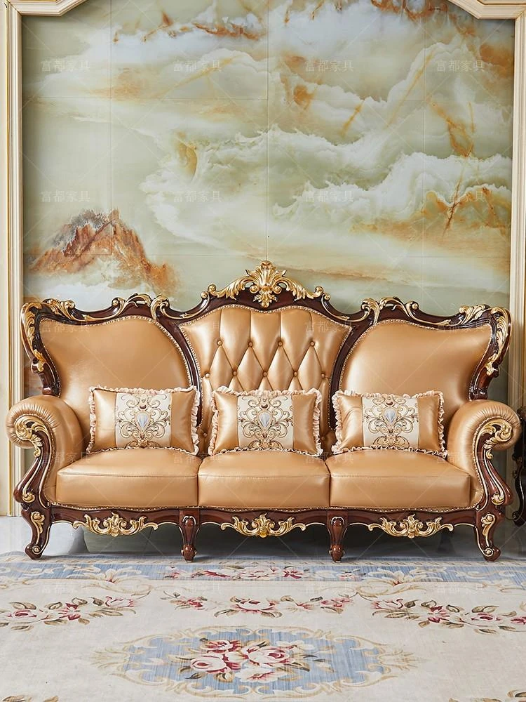 豪華な欧式本革ソファ123組み合わせ!実木彫刻のヴィラスタイル、深い紅檀色で洗練されたリビングルームを演出。上質な家具セットで、あなたの空間をより特別に。