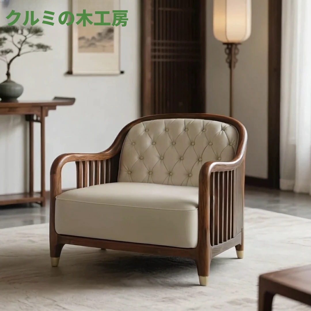 宋風美学の北米黒胡桃木製ソファチェア2025デザイナーの一人掛け椅子新中式無垢材リラックスソファ - 優雅なデザインで心地よいひとときをお楽しみください!
