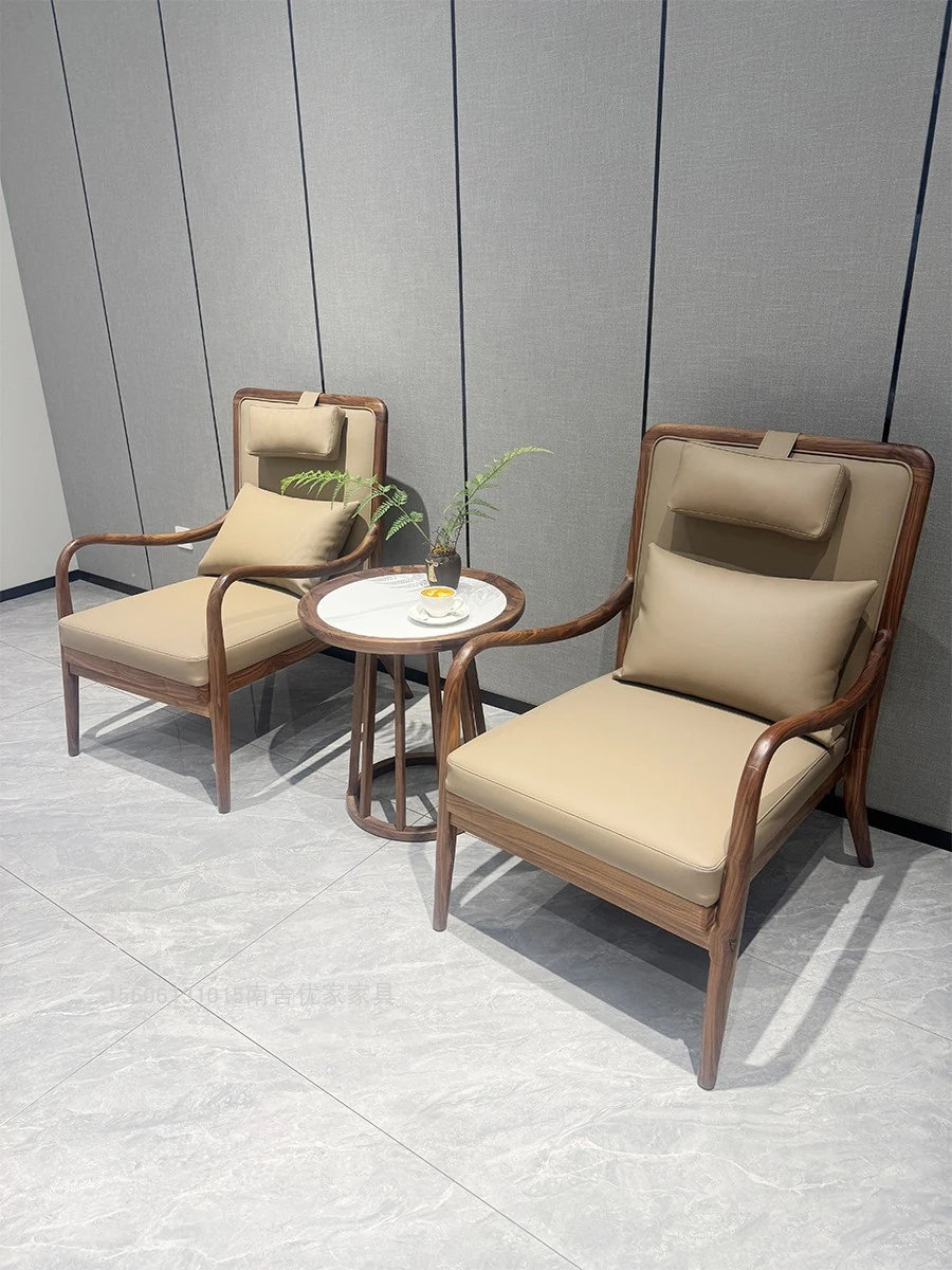 新中式スタイルのシンプルでリラックスできる3点セット、ブラックウォールナット材使用のソフトパッド付きハイバックチェア。半リクライニングで、禅の雰囲気を楽しみながら書斎やリビングに最適!