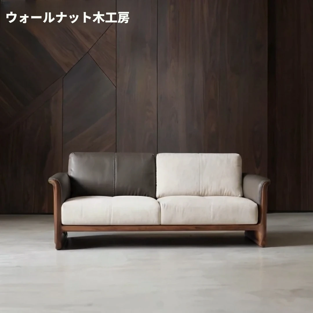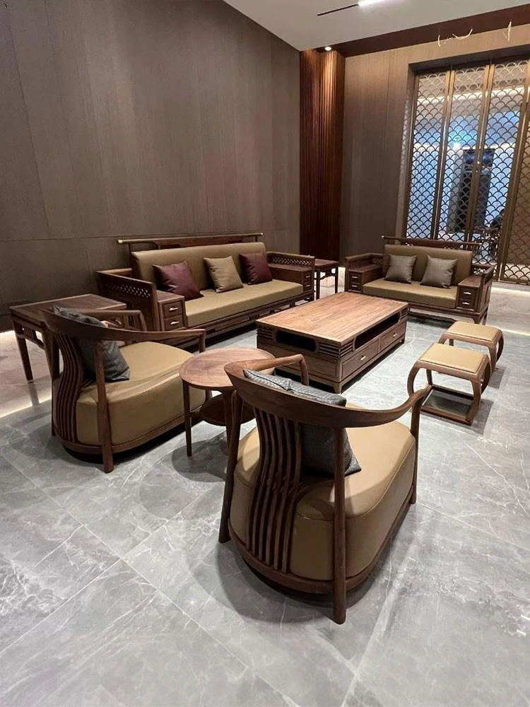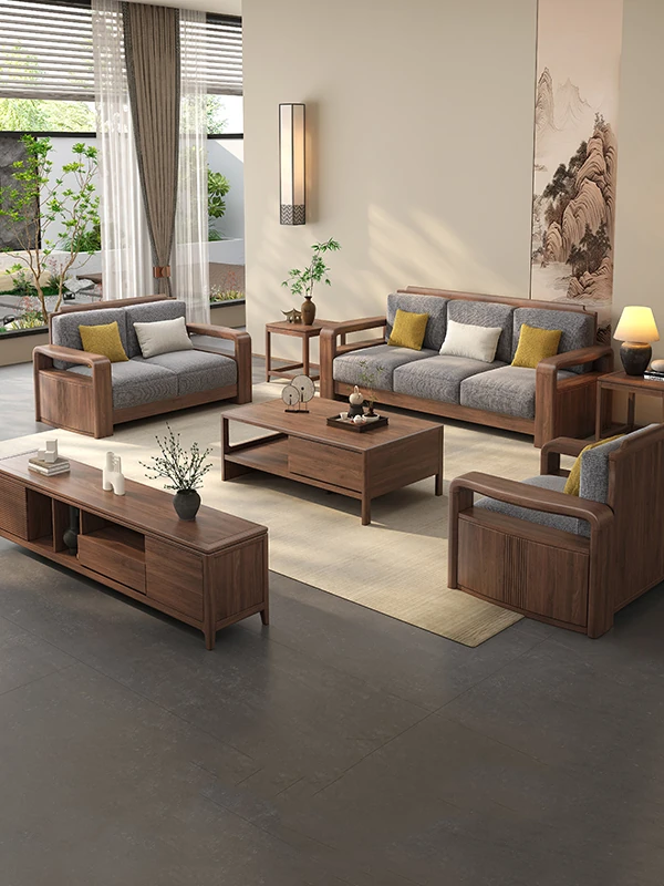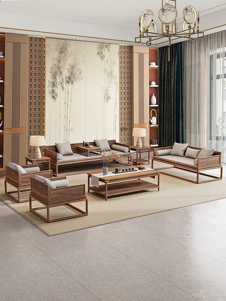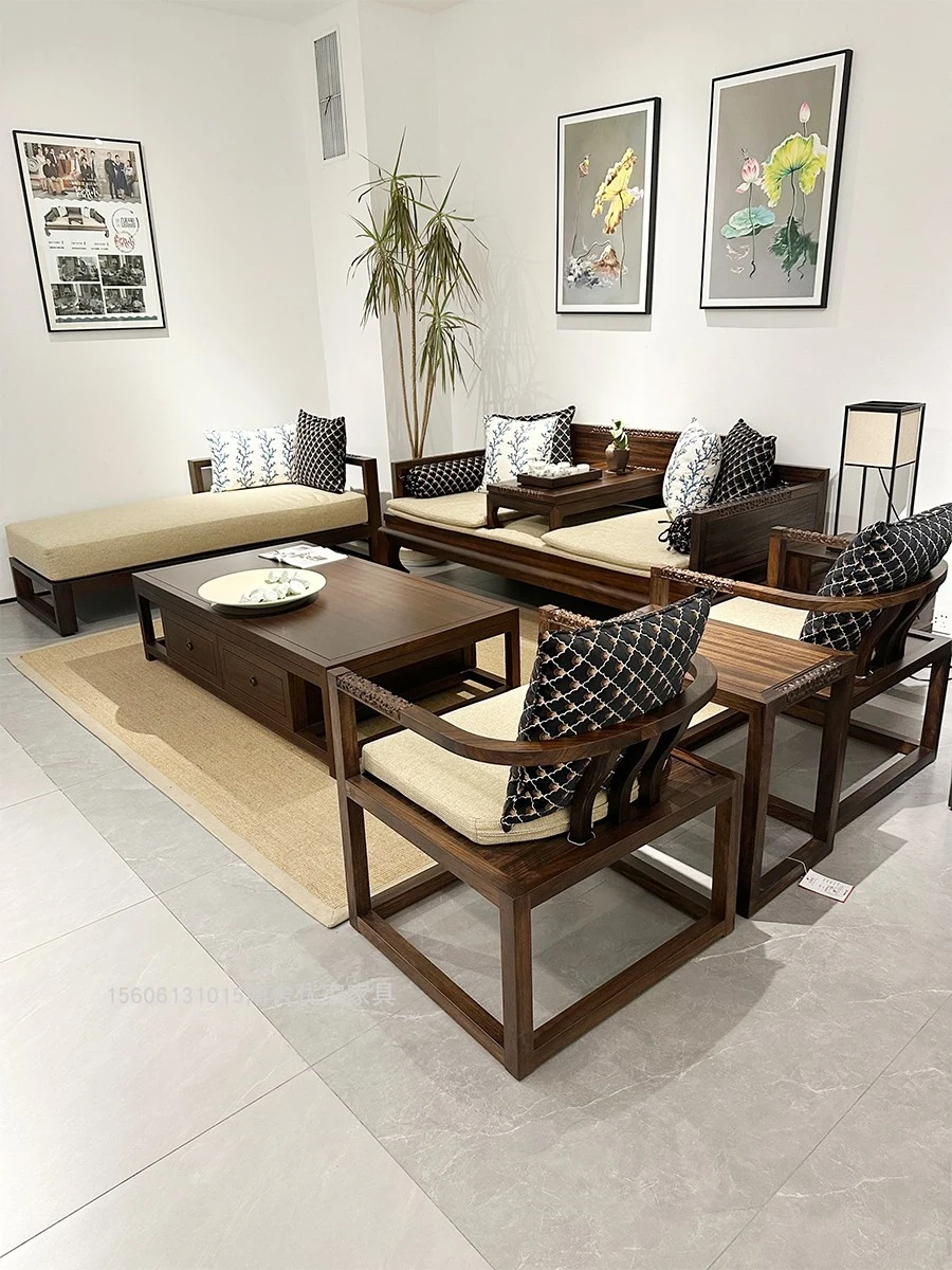 新中式デザインの北米産ウォールナット無垢材ソファセット!モダンでシンプル、リビングや別荘にぴったりのスタイリッシュな家具。上質な素材と洗練されたデザインで、贅沢な空間を演出します。