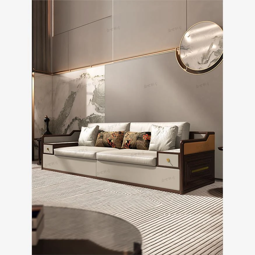 新中式デザインの実木製ソファ!シンプルで洗練された別荘向けリビングに最適な本革ソファセット。高級ウッディー仕上げで、モダンな中式の美しさを引き立てます。あなたの空間に洗練された贅沢を。