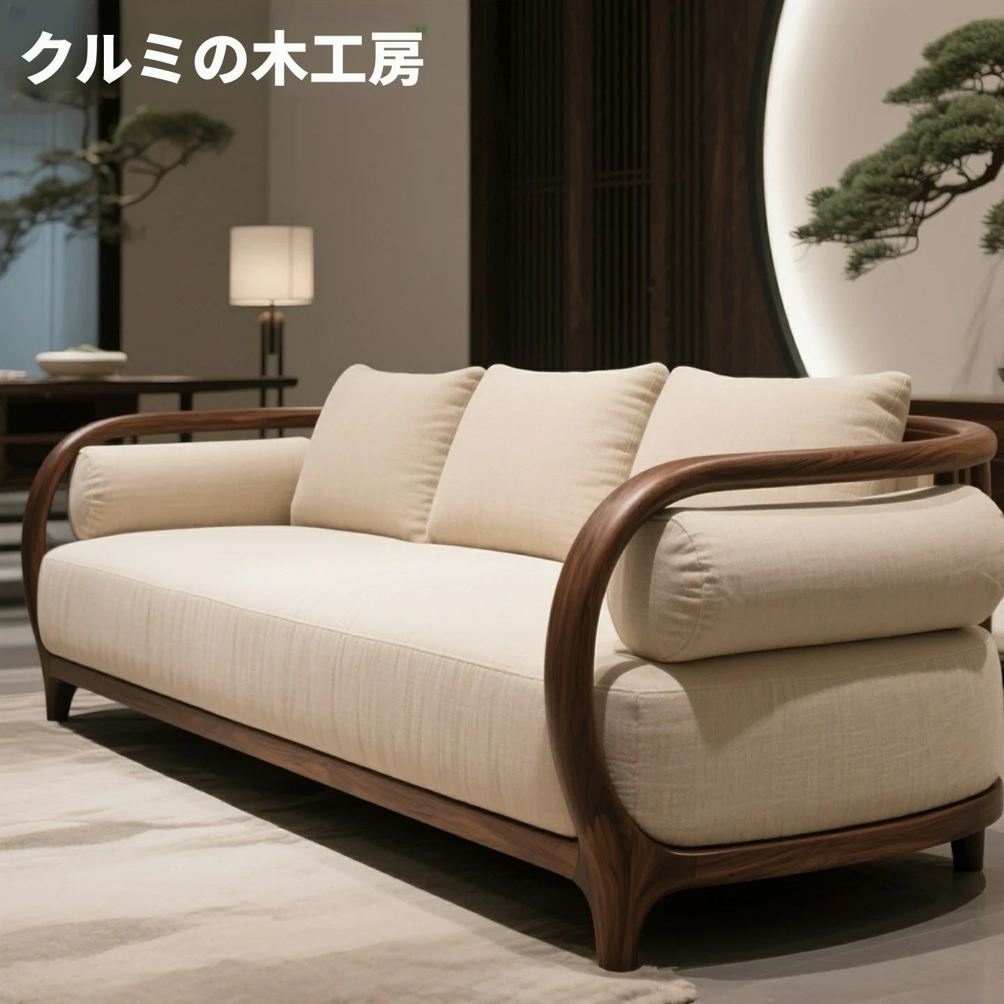 新中式スタイルのローハンベッドソファ、布製3人掛け、北米産ブラックウォールナット無垢材使用、宋氏美学のリビングルームにぴったりなソファセット!上質な素材と洗練されたデザインで、居心地の良い空間を演出します。