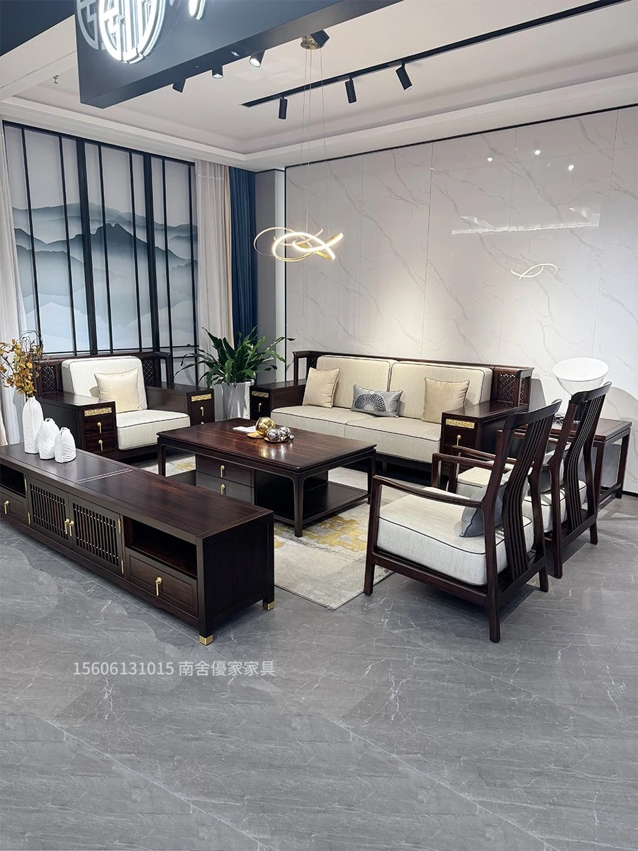 新中式の無垢材ソファセット|モダンでシンプル、ラグジュアリーな高級感|別荘や広い住空間に最適|ウッディな黒檀の禅スタイル家具で癒しのひとときを。