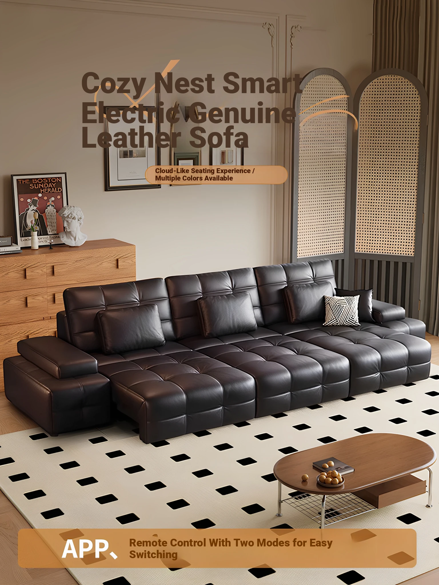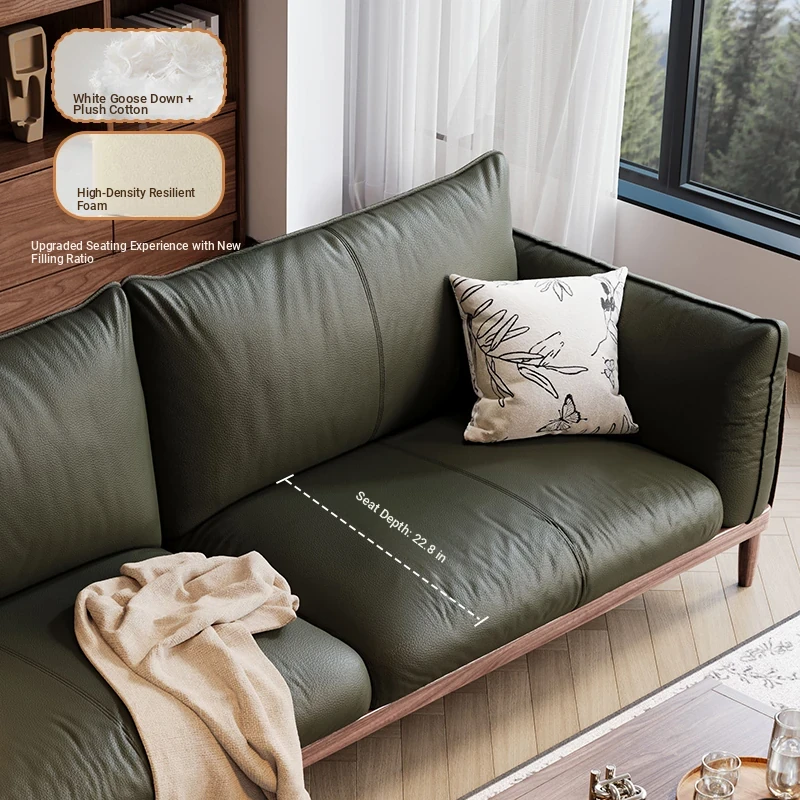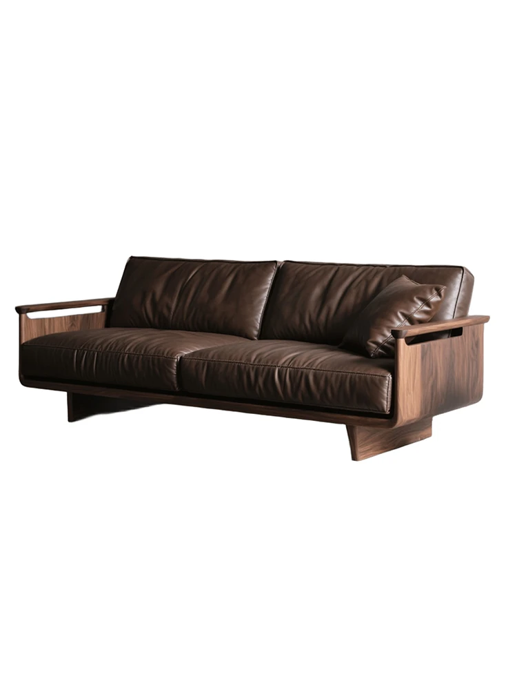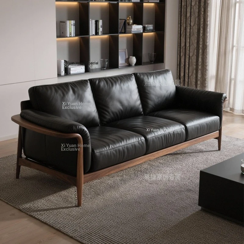 Yamoo North American Black Walnut Sofa - Scandinavian Minimalist Genuine Leather Living Room Sofa - Solid Wood Straight Design for Home Use