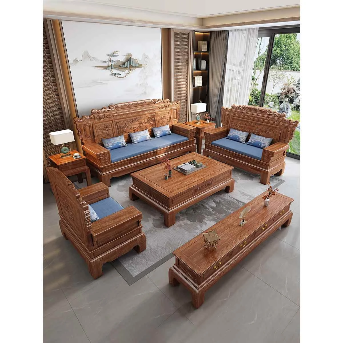 New Chinese Style Blackwood Solid Wood Sofa - Versatile Design for Both Winter and Summer, Perfect for Villas and Spacious Homes, Luxurious Hardwood Furniture