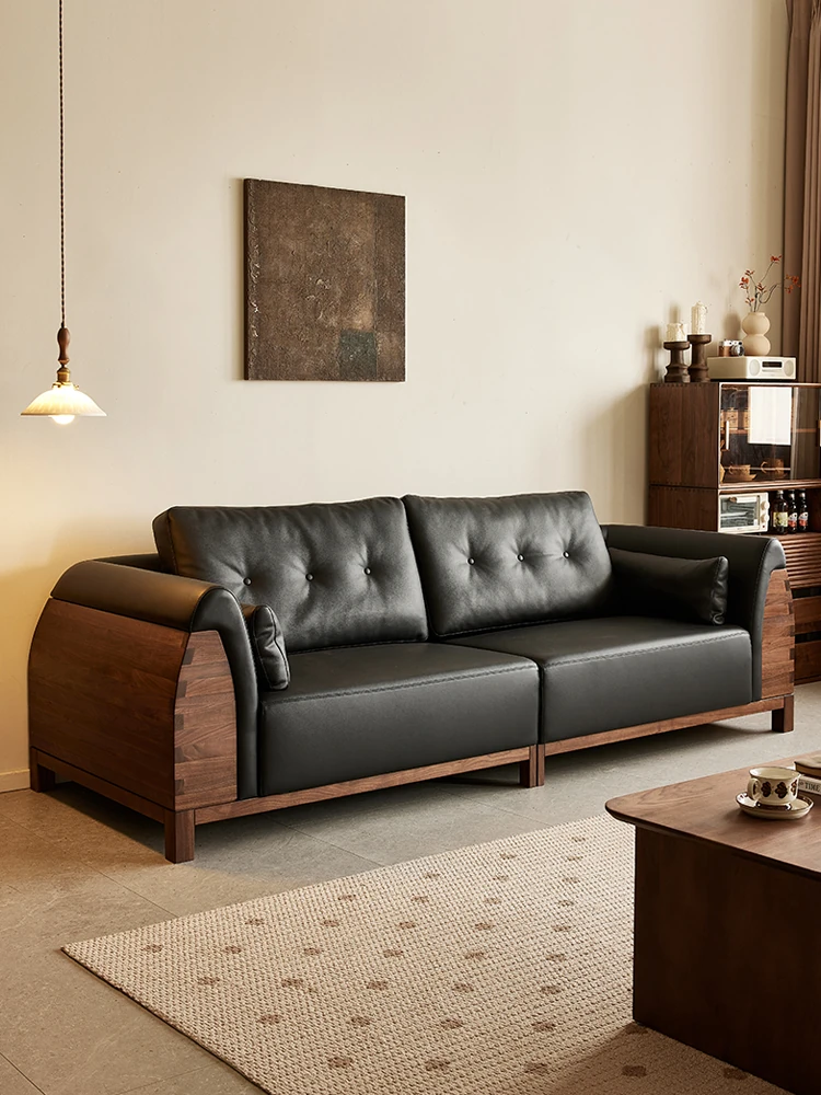 2025 New Chinese Style Solid Wood Sofa - Modern Minimalist Black Walnut Sofa with Vintage Touch, High-End Leather Sofa for Home Use