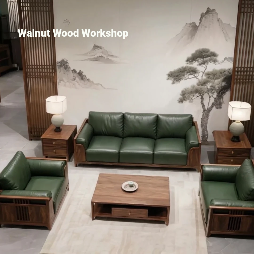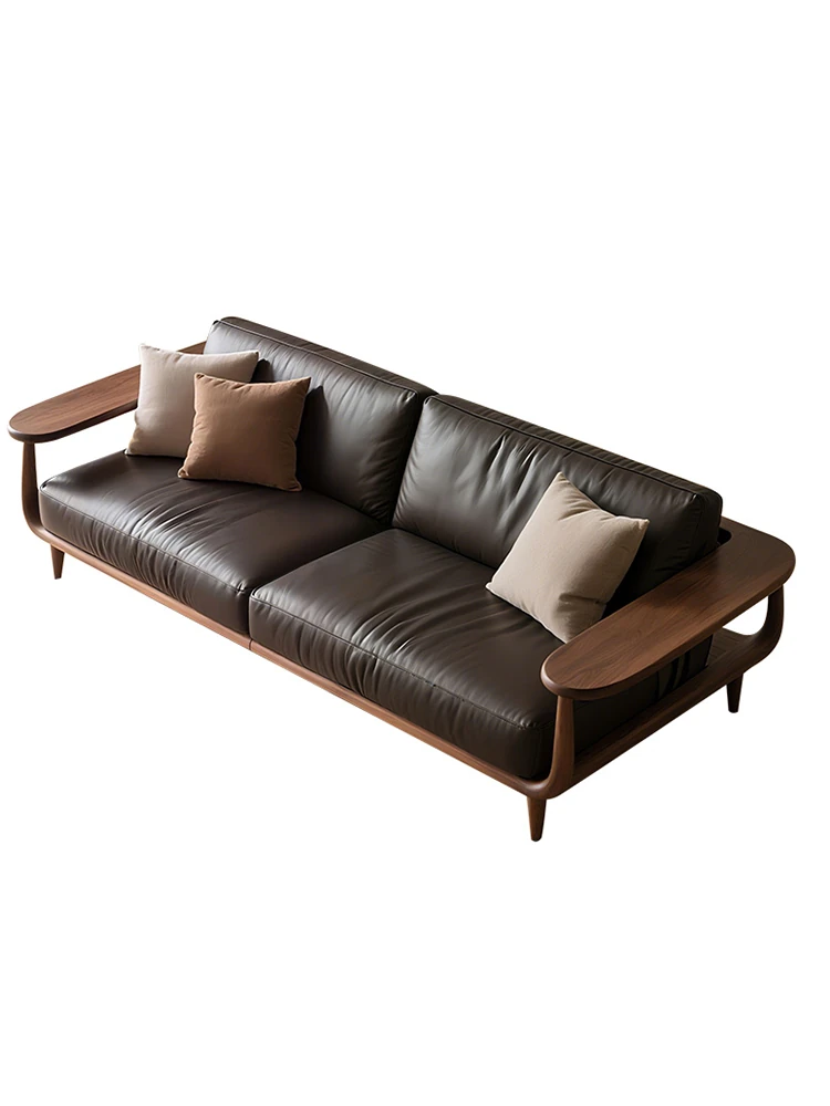 2025 New Chinese Style Solid Wood Sofa Set - Wabi-Sabi Inspired Living Room Sofa in Walnut with Leather Upholstery, 3-Seat Design for Home Comfort