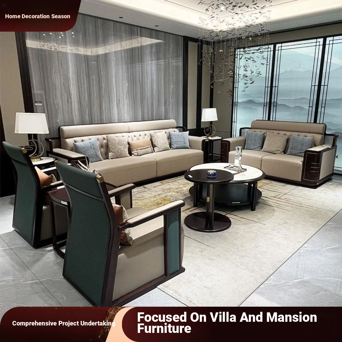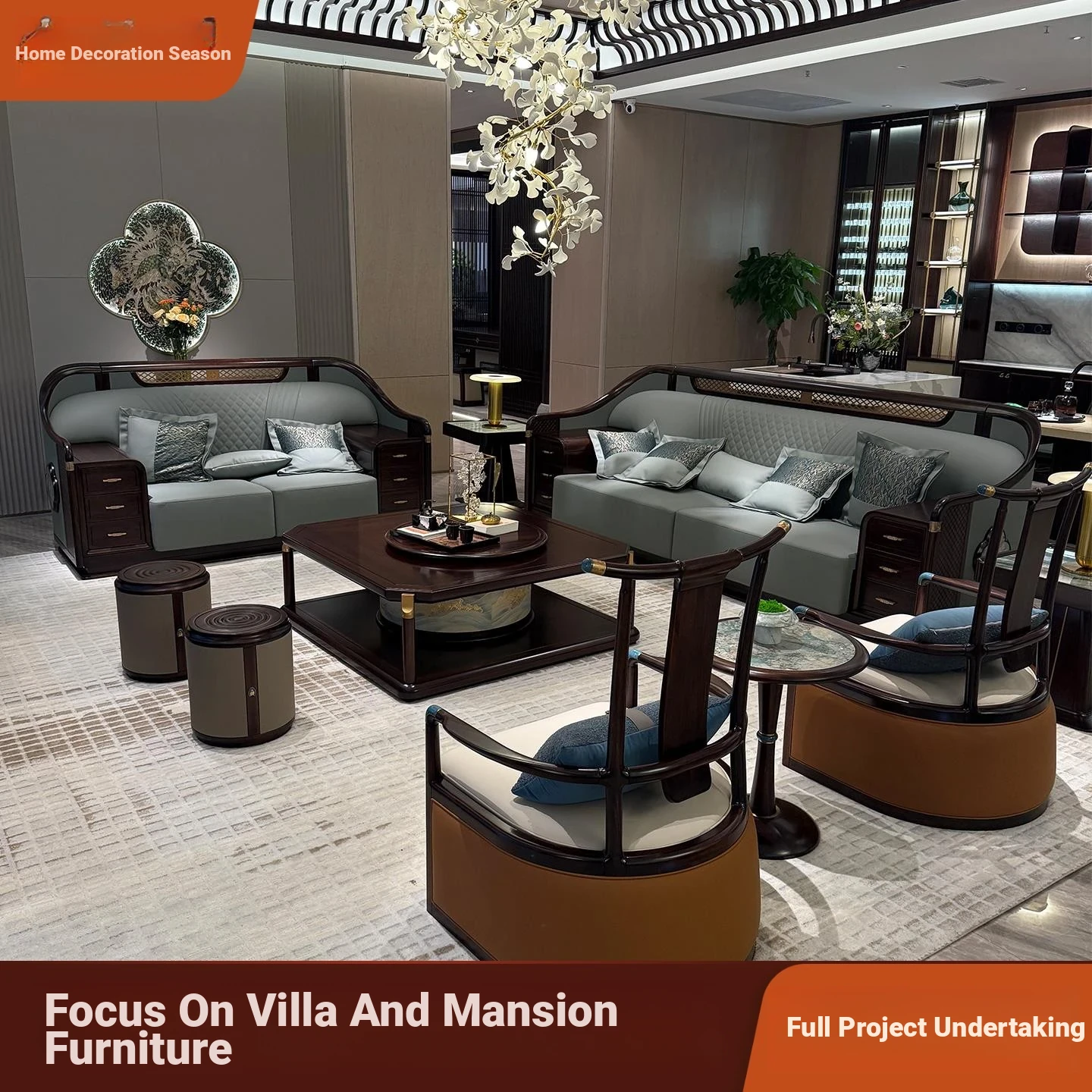 Elegant New Chinese Style Solid Wood Chaise Lounge Sofa Set for Living Room - Perfect for All Home Sizes, Embracing Zen Aesthetics & Luxury Villa Vibes with High-Quality Wooden Furniture.
